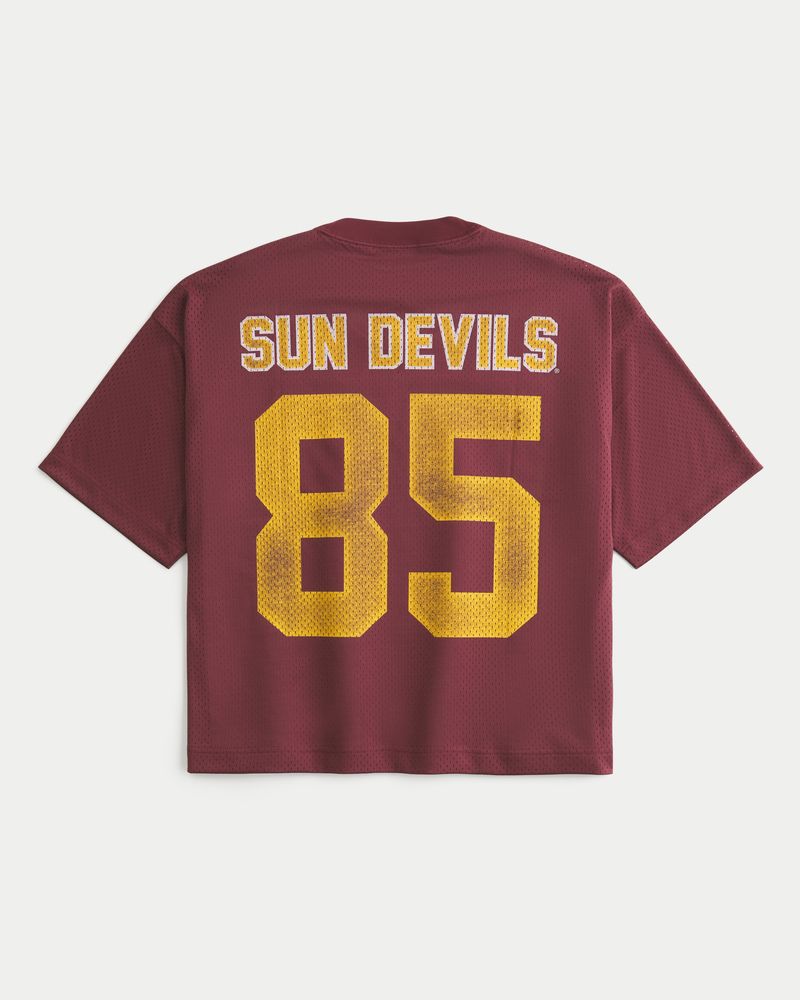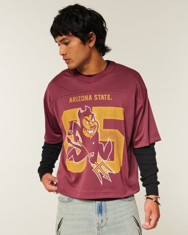 This classic football jersey is made with soft mesh fabric and features official licensed Arizona State University print graphics at the front and back. V-neckline, short sleeves. Baggy Crop Fit. Imported.