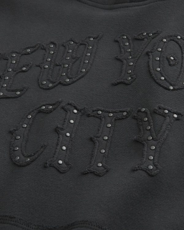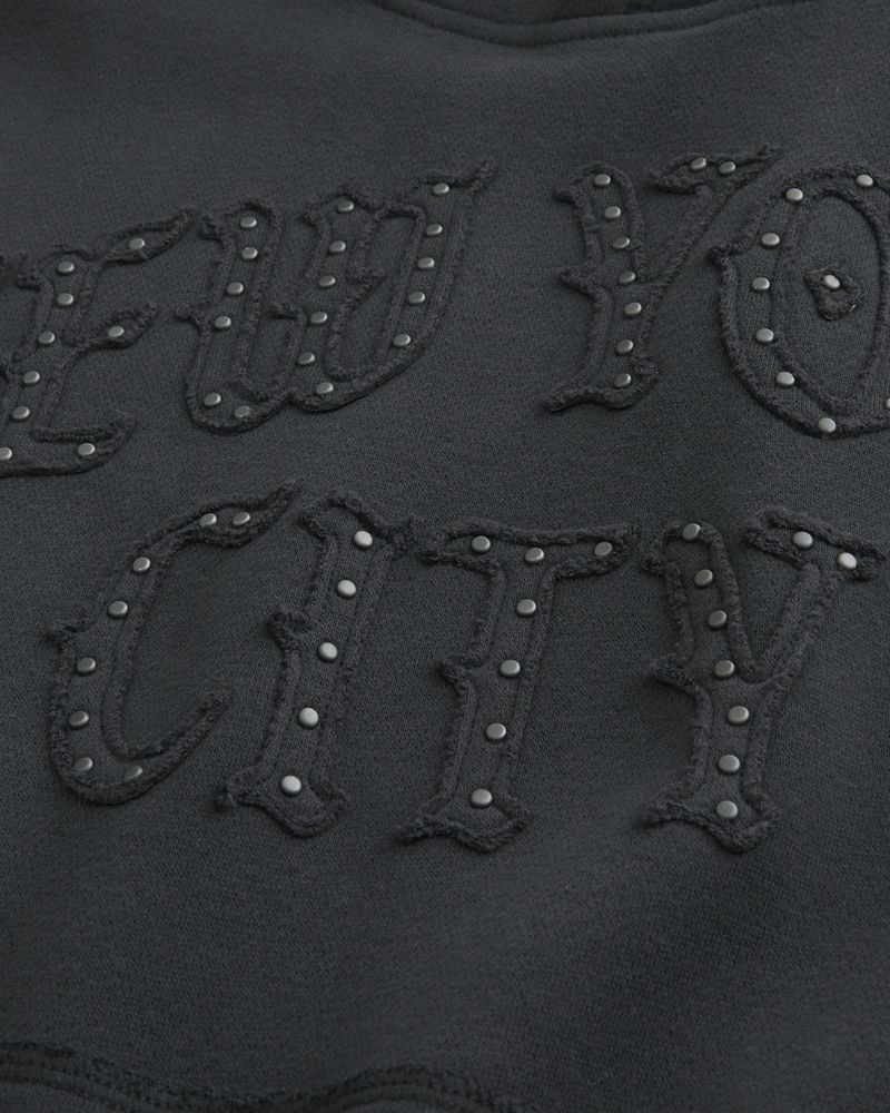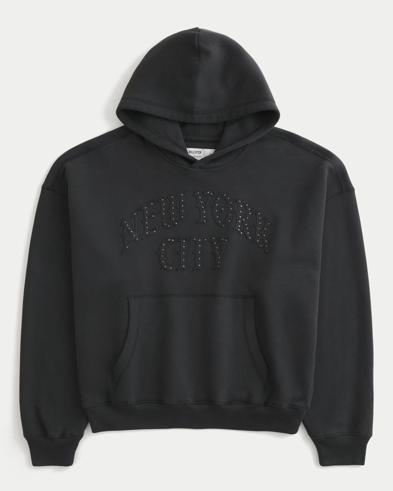 This super soft fleece hoodie features studded New York City graphic applique. Hood, front pouch pocket, long sleeves. Baggy Cinch Fit. Imported.