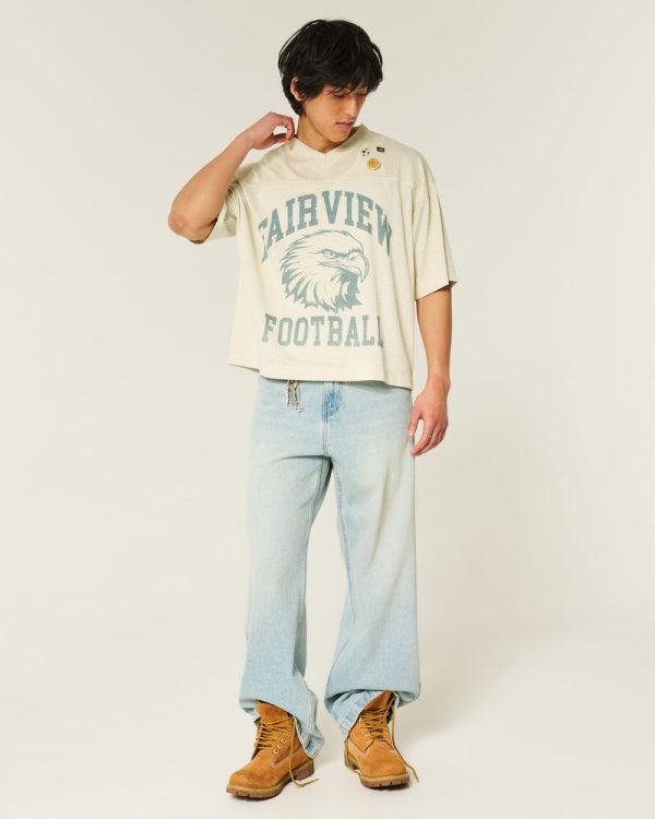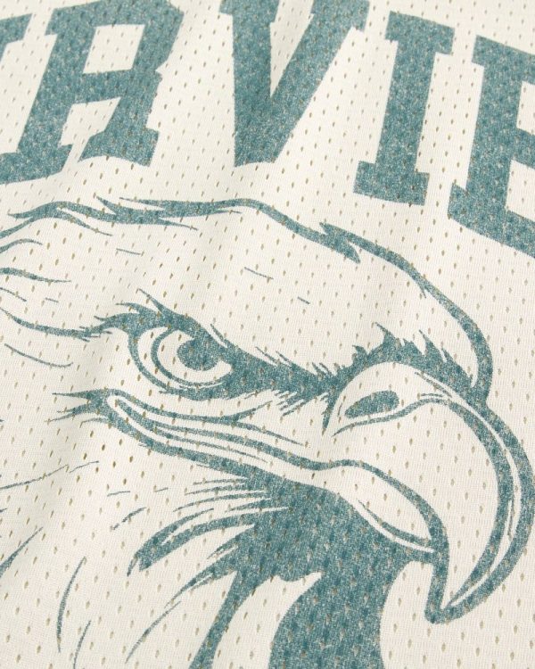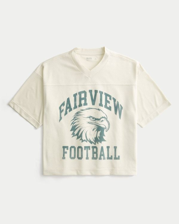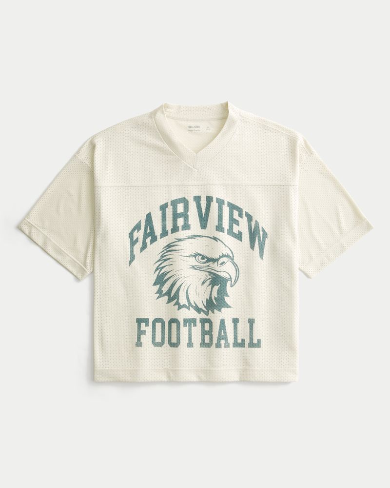 A classic football jersey in mesh fabric, featuring Fairview Football print graphics, a v-neckline and short sleeves. Boxy Crop Fit. Imported.