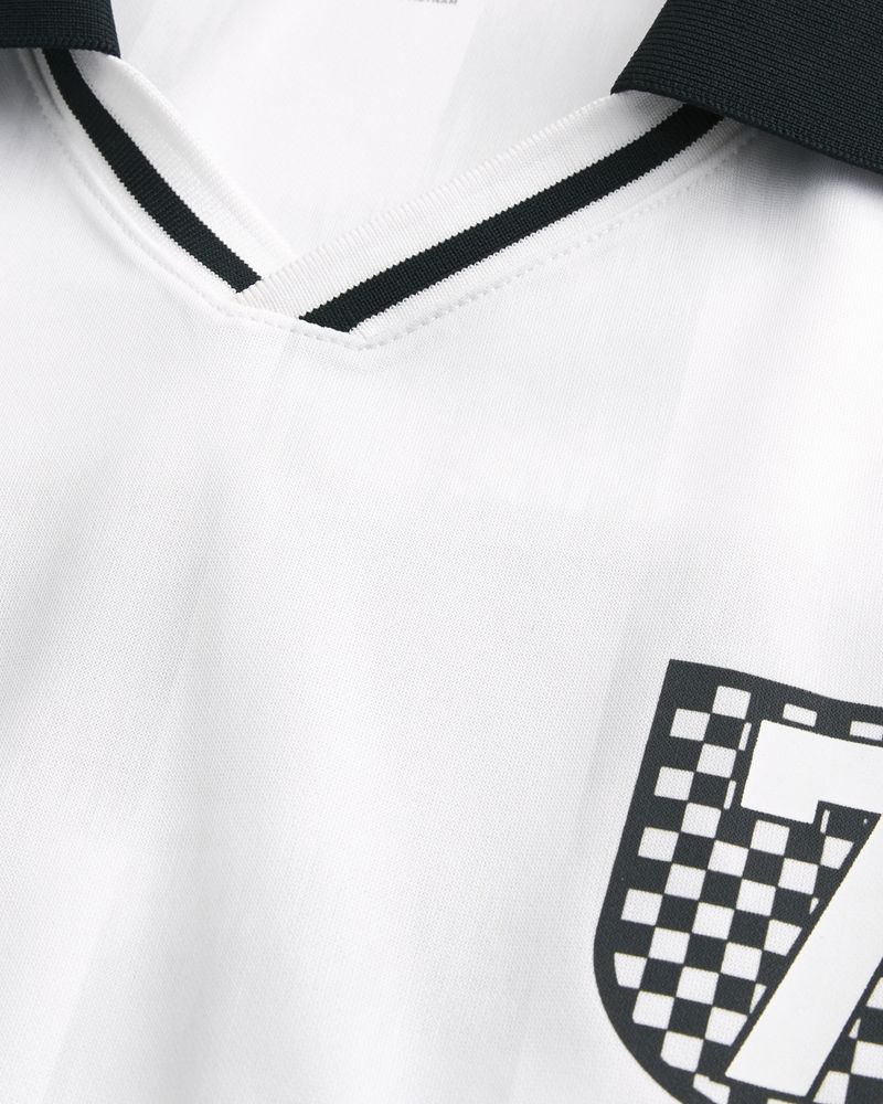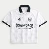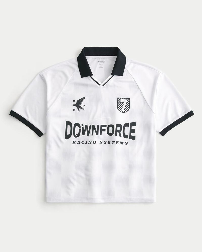 A classic soccer jersey featuring a Downforce Racing print graphic at the front and number graphic at the back. Collar, super soft and sporty fabric, short sleeves. Boxy Fit. Imported.