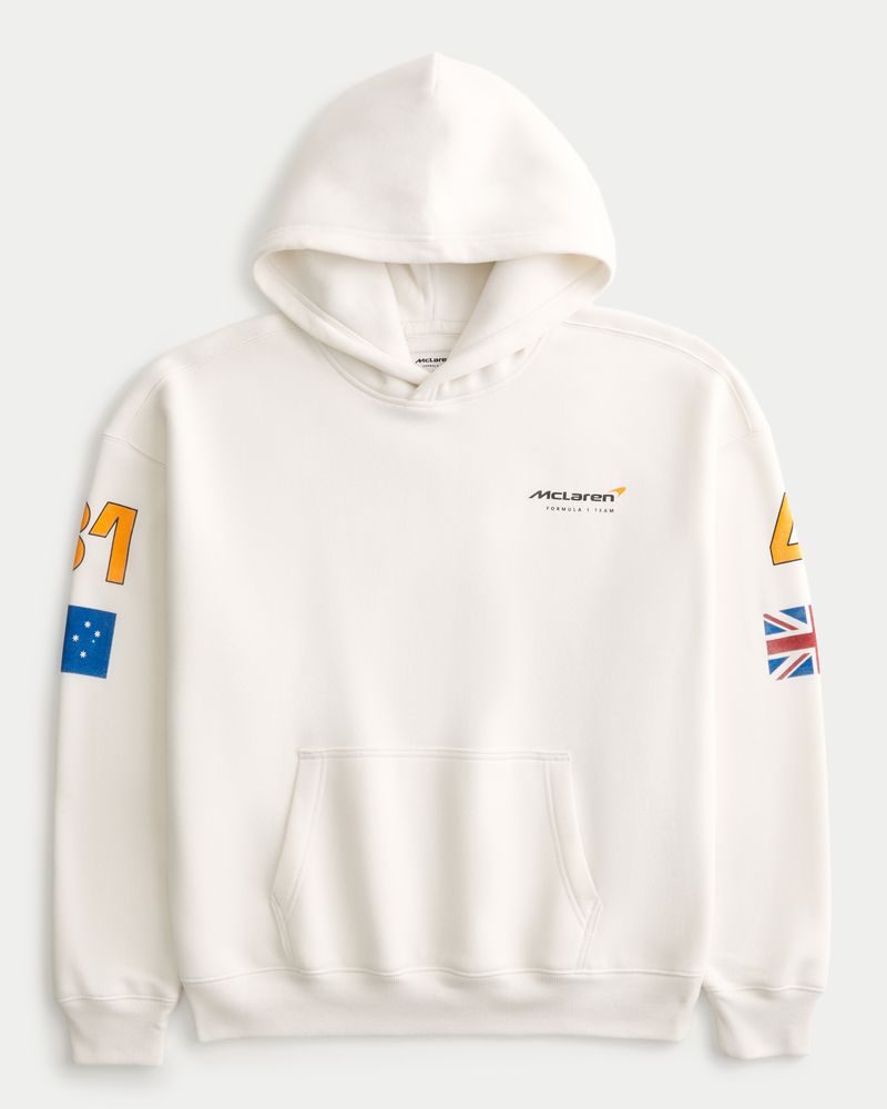 This super soft fleece hoodie features official licensed McLaren Formula 1 Team print graphics at the left chest, sleeves and back. Hood, front pouch pocket, long sleeves. Boxy Fit. Imported.