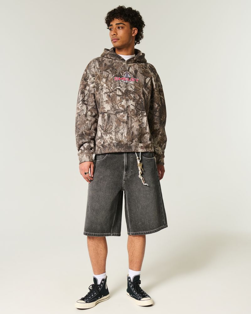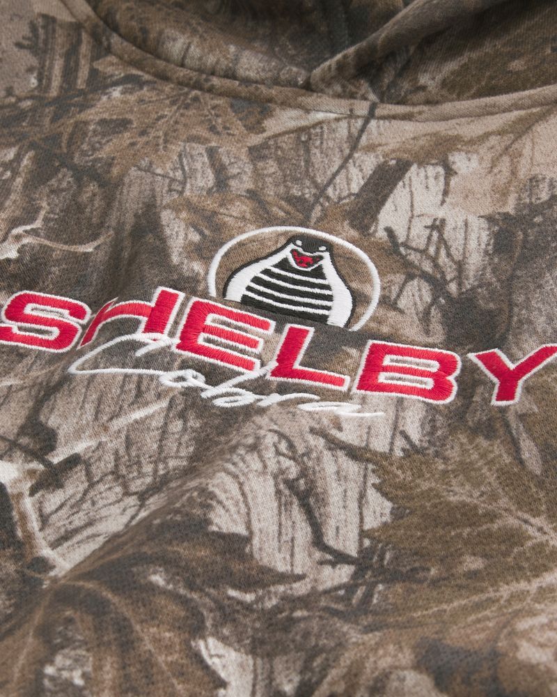 A super soft fleece hoodie featuring official licensed Shelby Cobra graphic embroidery and an all-over camo pattern. Long sleeves, hood, front pouch pocket. Boxy Fit. Imported.