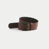 A classic genuine leather belt with a square metal buckle and embossed logo detail. Imported.