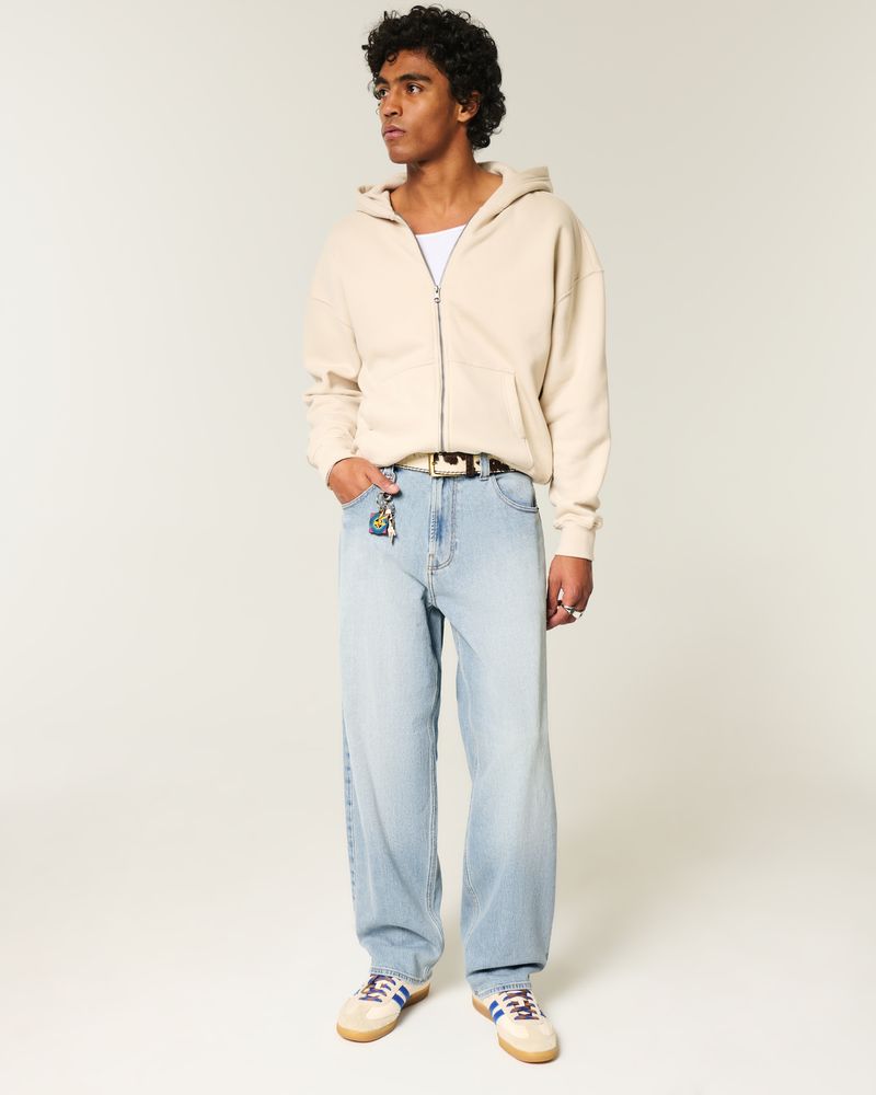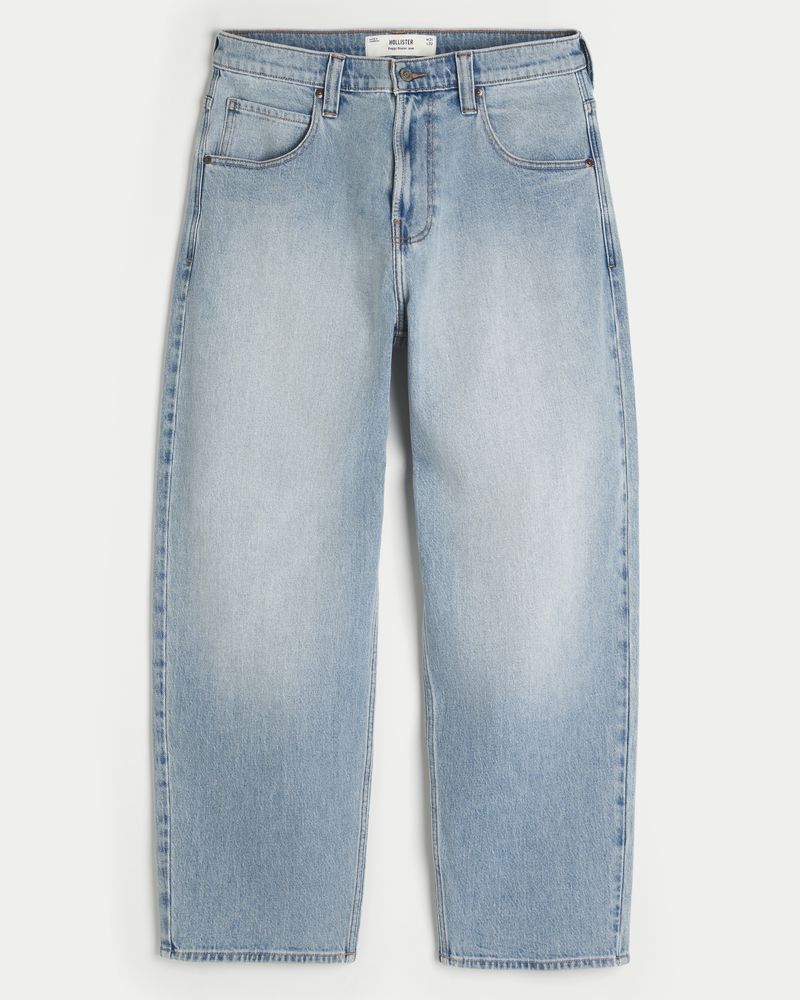 Comfortable denim skater jeans designed with a baggy leg. Light wash with subtle fading, classic 5-pocket styling, embroidered graphic at back pocket. Imported.