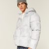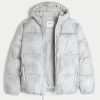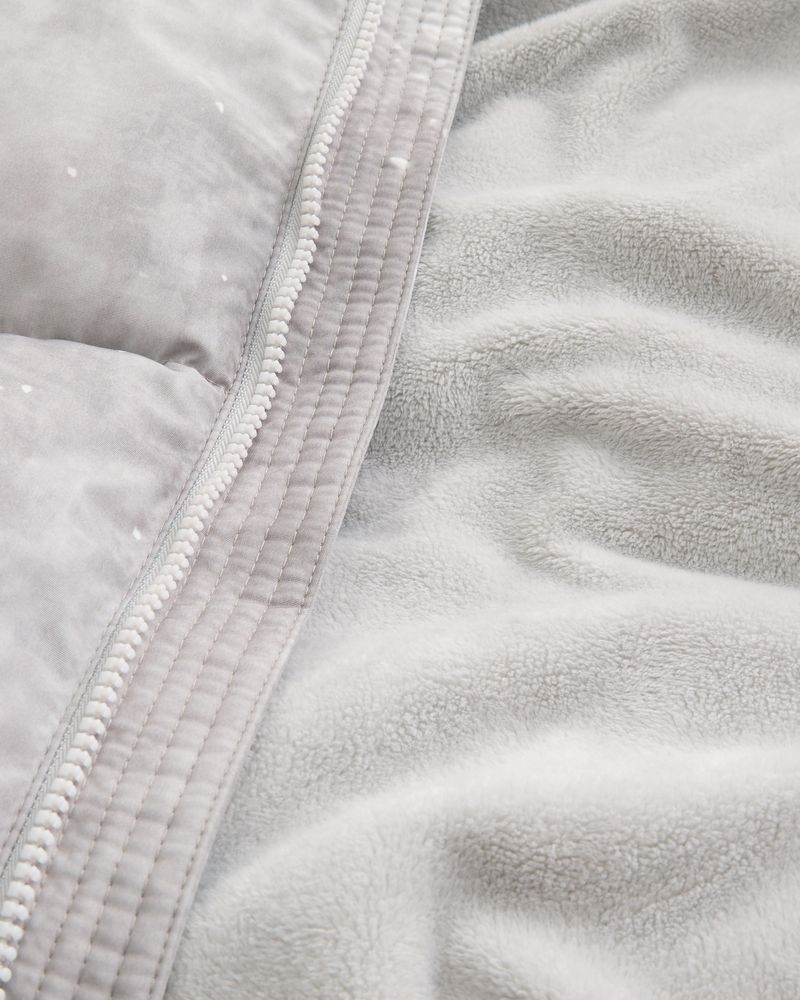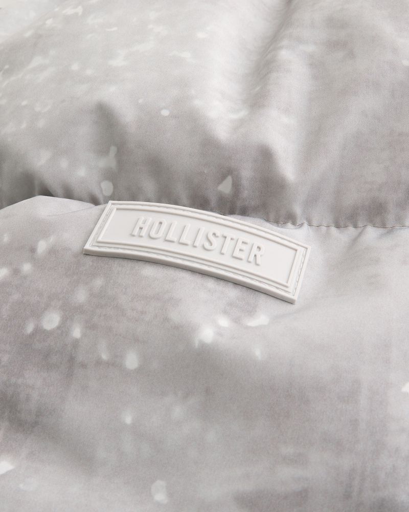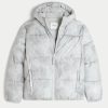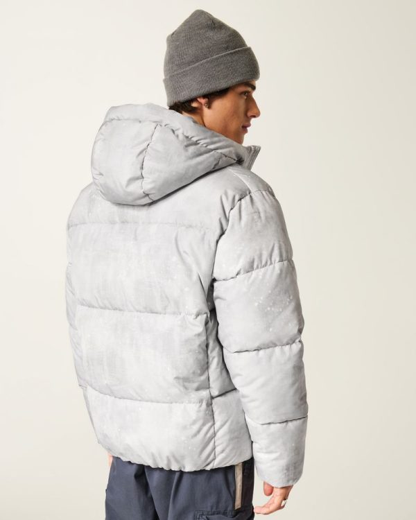 A faux fur-lined puffer jacket designed with wide quilted channels, a full zip-up closure and front zipper pockets. Faux fur-lined hood, all-over splatter-style pattern, logo detail at left sleeve. Imported.