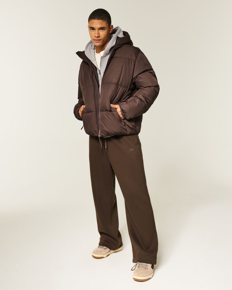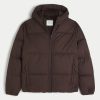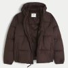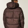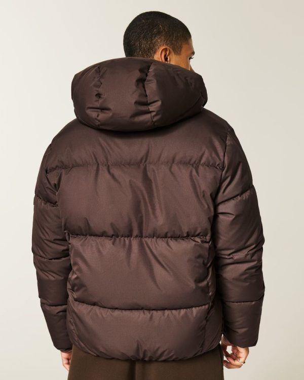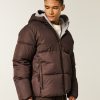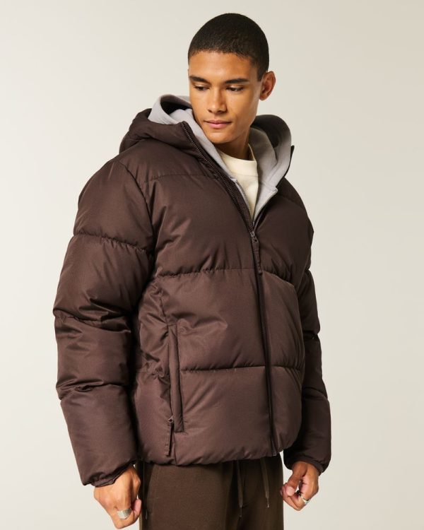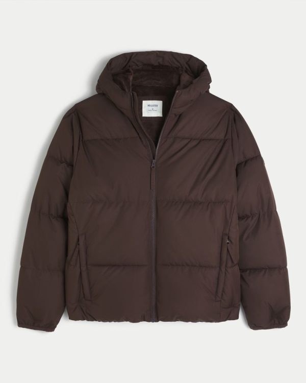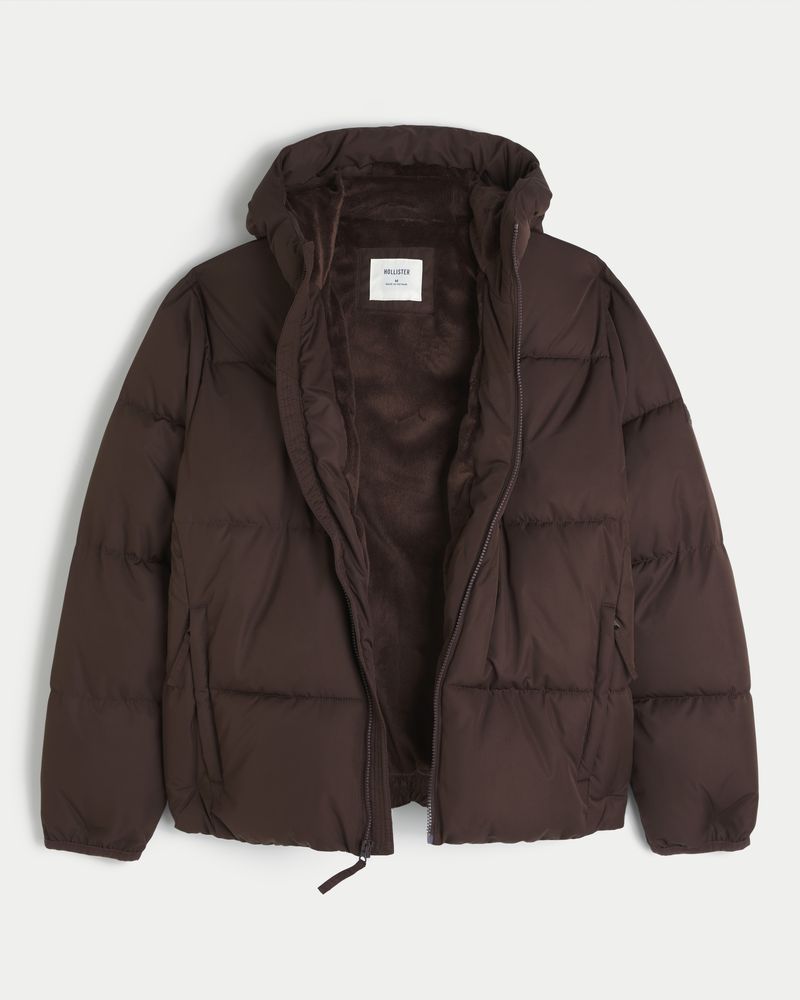 A hooded puffer jacket with faux fur lining and wide quilted channels. Cinched hems, front zipper pockets, hood. Imported.
