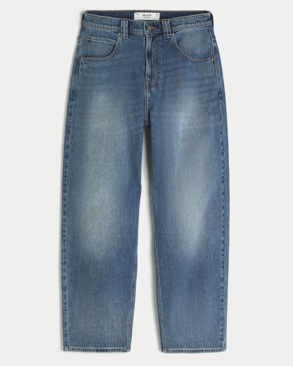 Comfortable denim skater jeans in a medium wash, designed with a baggy leg. Fading, whiskering, embroidered shark graphic at back pocket. Imported.