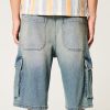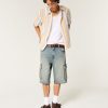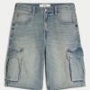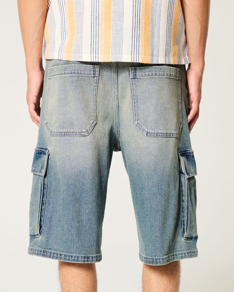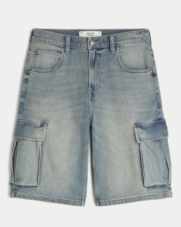 Ultra-comfortable denim shorts designed with a super baggy fit and side cargo pockets. Medium wash with fading and whiskering. Hits below the knee. Imported.