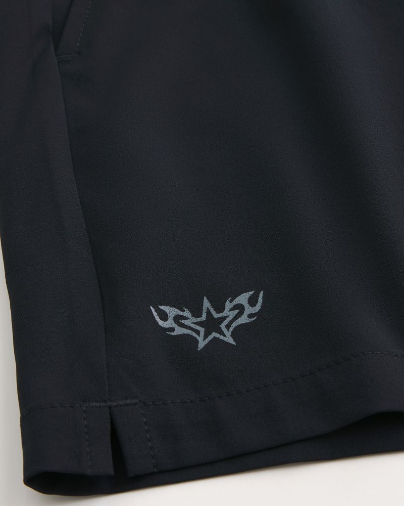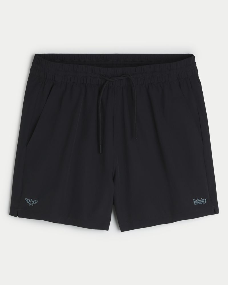 Comfortable active shorts with stretch, designed with a mid-thigh length and drawstring waist. Logo detail, pockets. Imported.