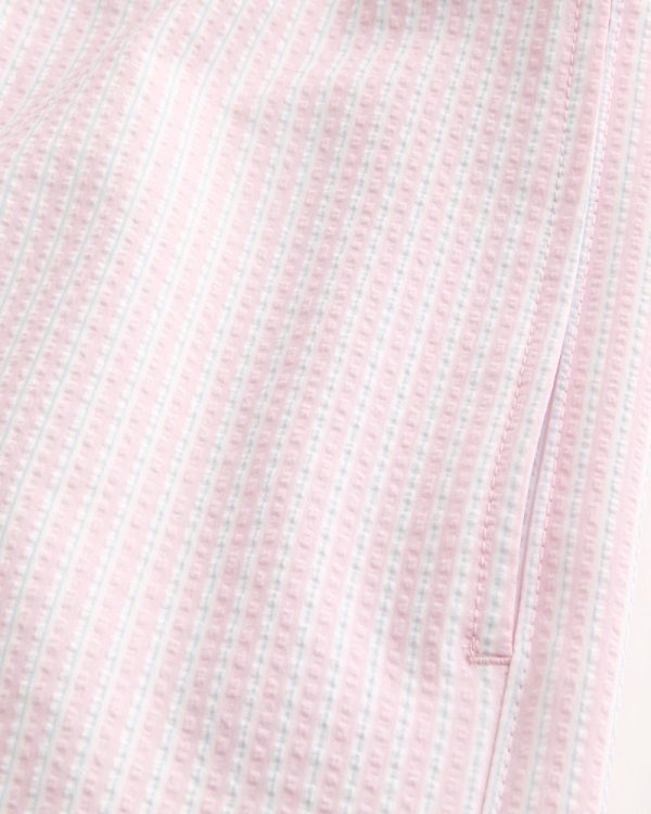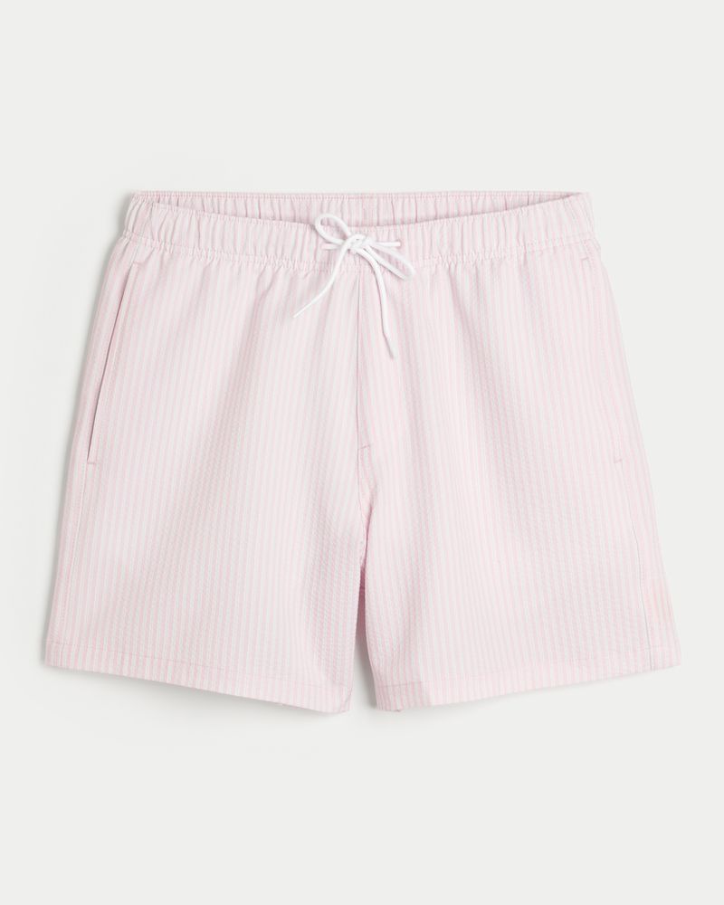 Shorter-length swim trunks that hit mid-thigh. Featuring comfortable 4-way stretch seersucker swim fabric and a 6″ inseam. Front pockets, mesh lining. Imported.