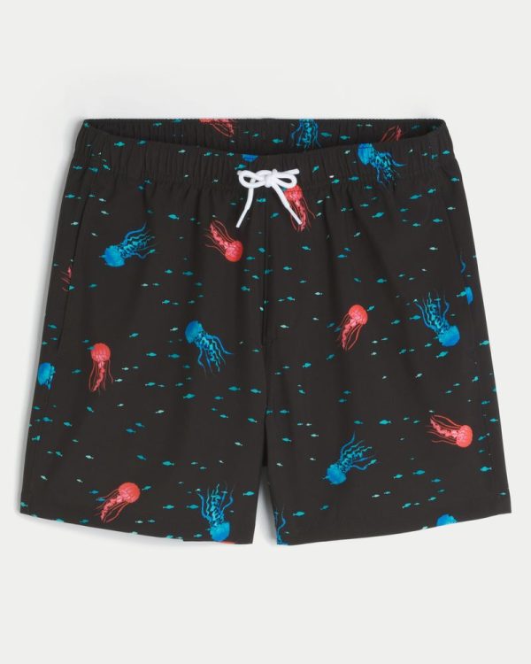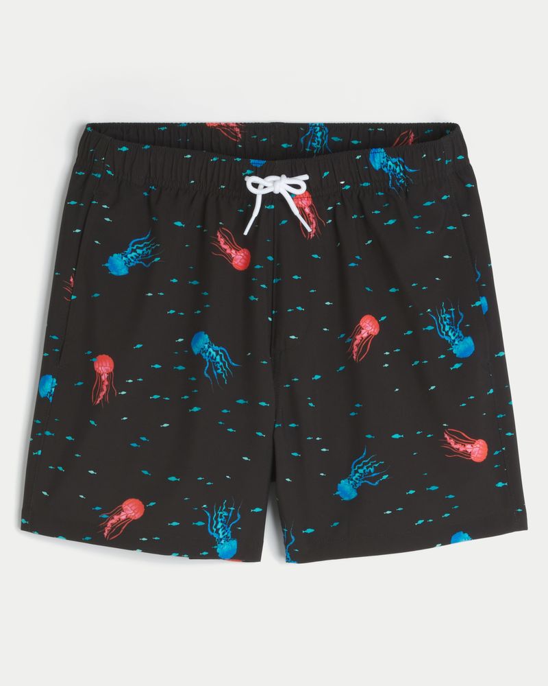 Shorter-length swim trunks that hit mid-thigh. Featuring comfortable 4-way stretch swim fabric and a 5.5″ inseam. Pockets. Imported.