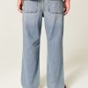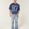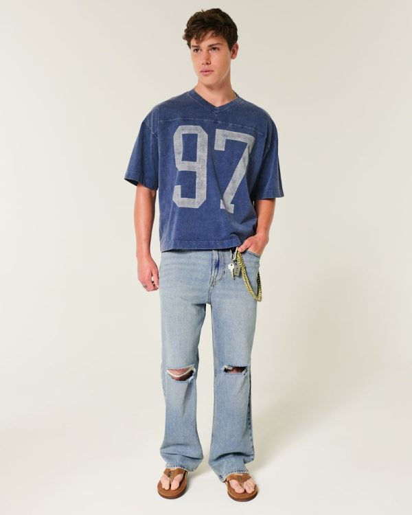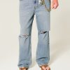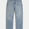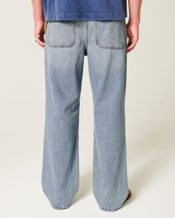 Comfortable denim jeans in a medium wash, designed with a baggy leg. Fading, whiskering, ripped details. Imported.