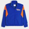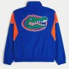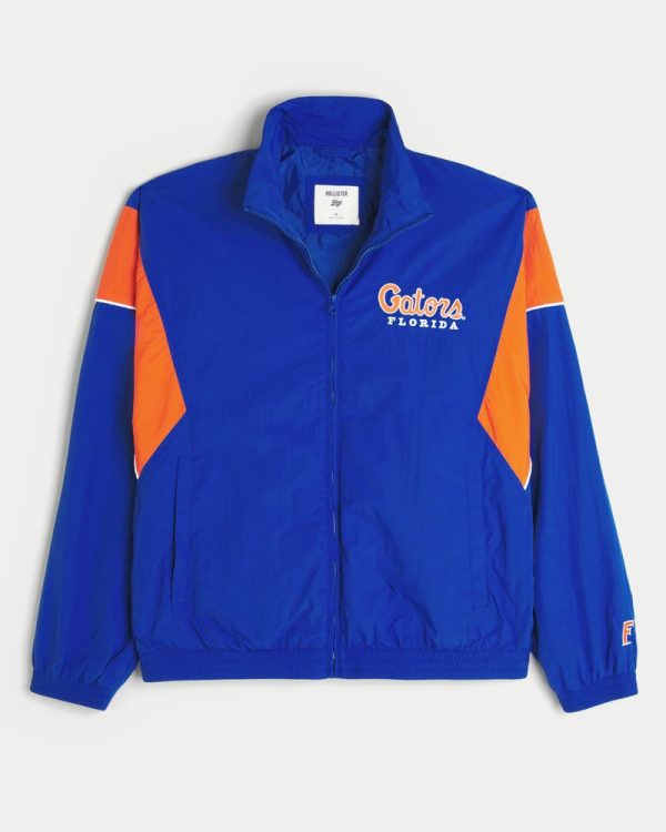 A classic collegiate windbreaker jacket, featuring official licensed University of Florida Gators graphic embroidery and applique at the left chest and back. Banded hems, mock-neck collar, pockets, full zip-up closure. Imported.