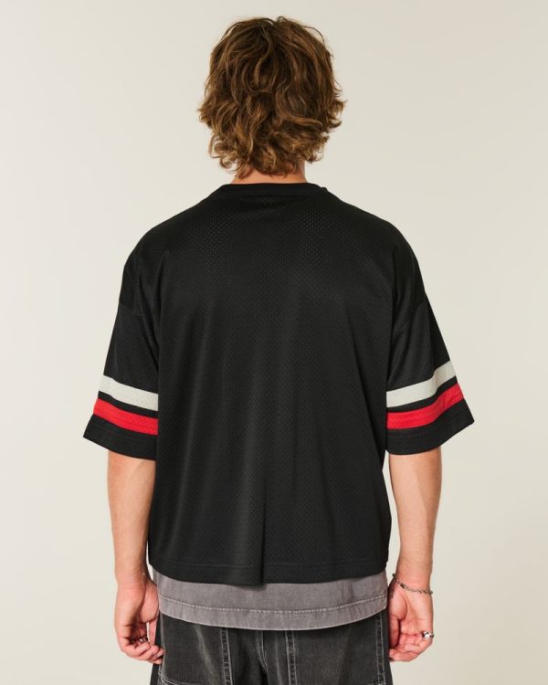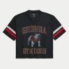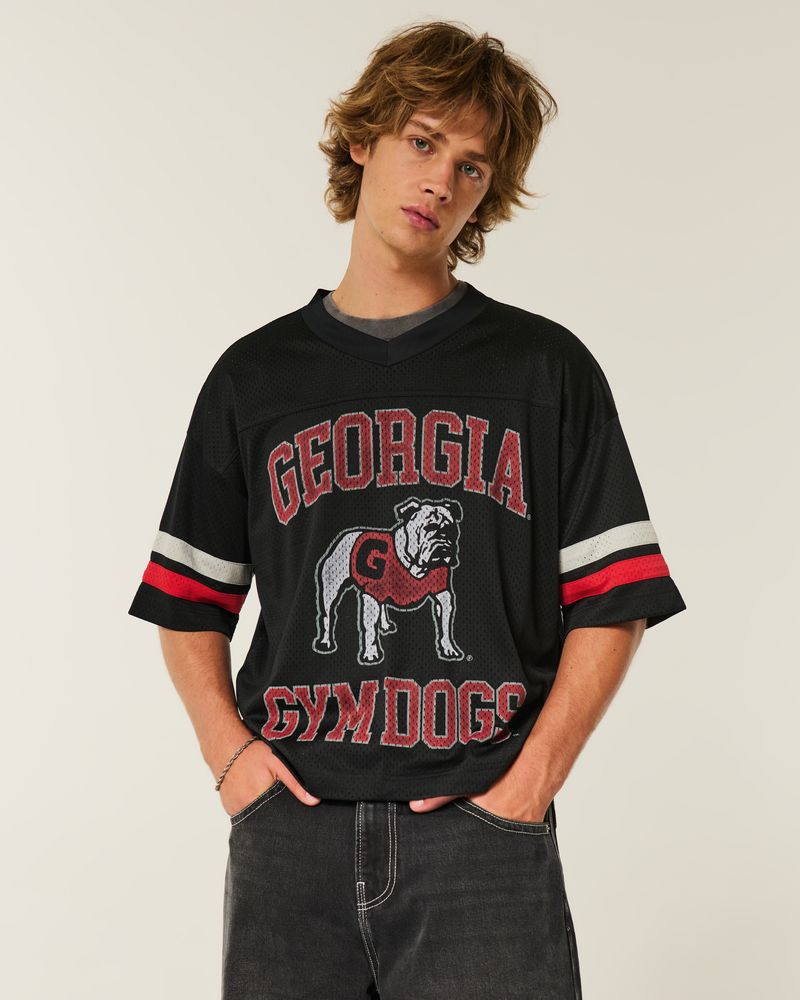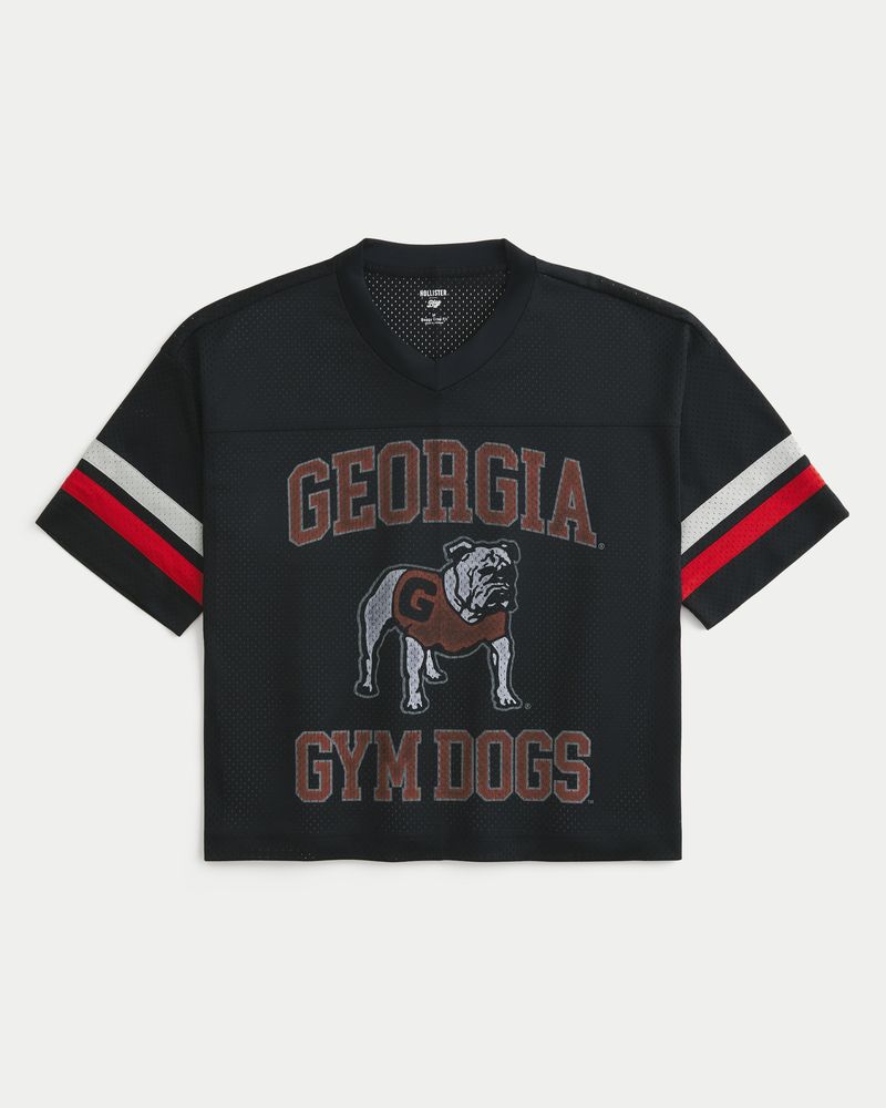 This classic football jersey is made with soft mesh fabric and features official licensed University of Georgia print graphics. V-neckline, short sleeves. Baggy Crop Fit. Imported.