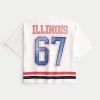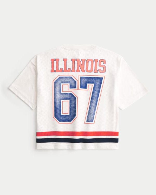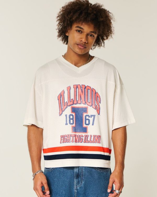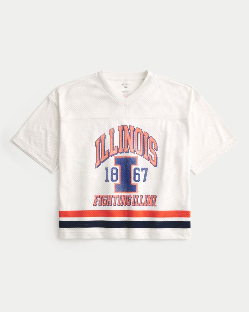This classic football jersey is made with soft mesh fabric and features official licensed University of Illinois print graphics at the front and back. V-neckline, short sleeves. Baggy Crop Fit. Imported.