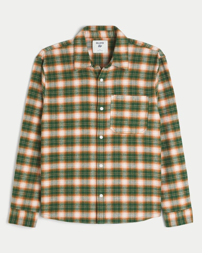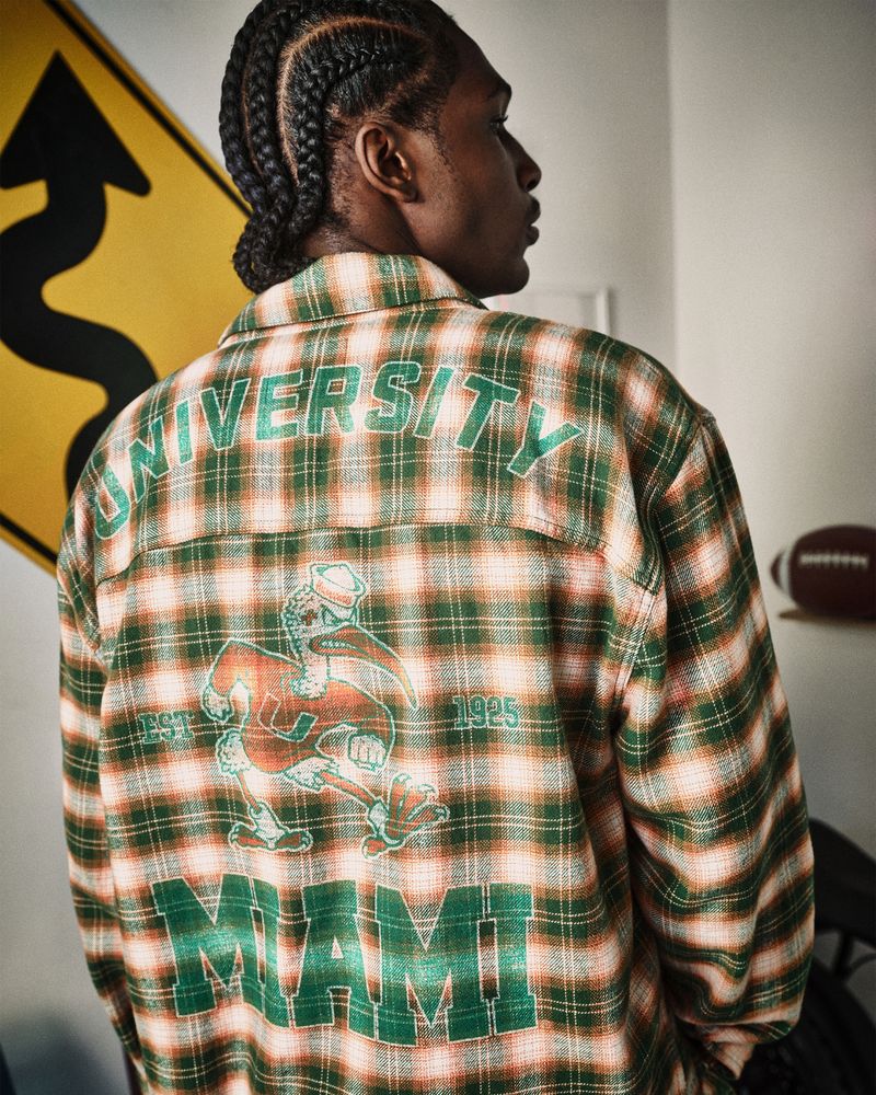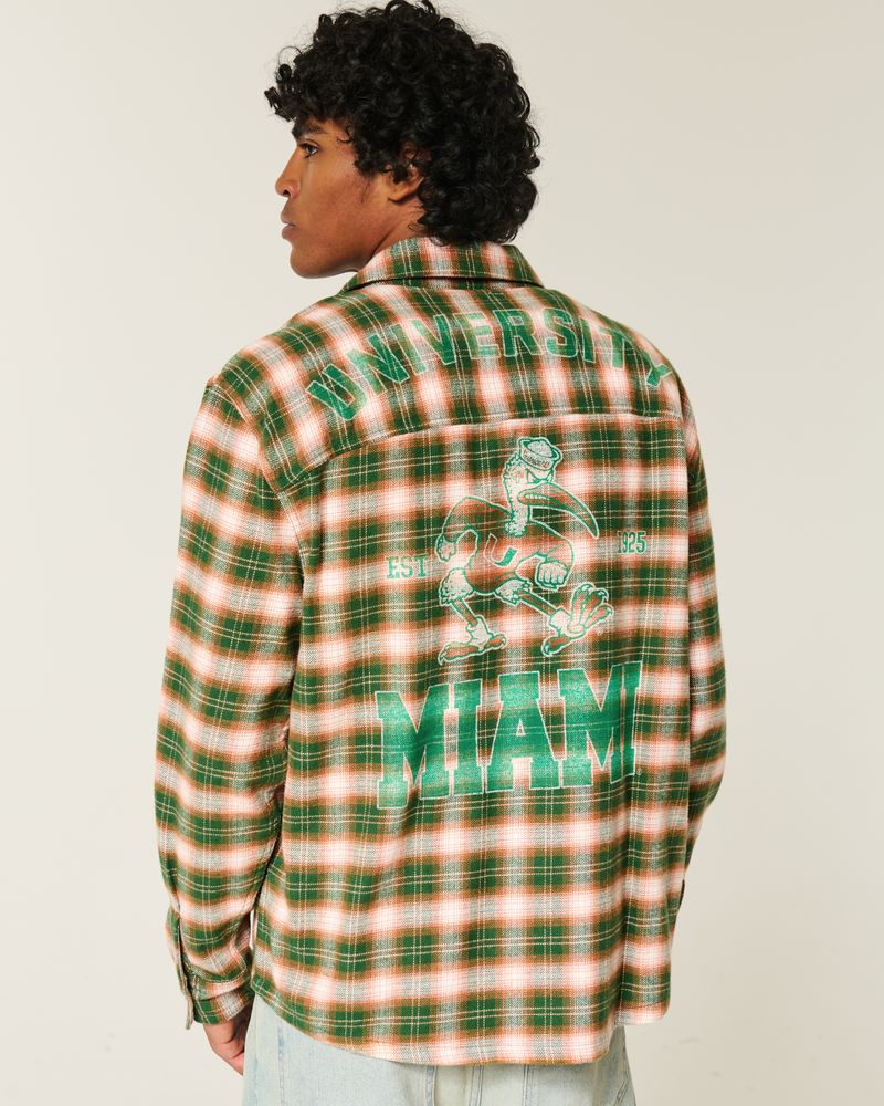 A long-sleeve shirt in soft flannel fabric, featuring official licensed University of Miami Hurricanes print graphics at the back. Full button closure, left chest pocket, collar. Imported.