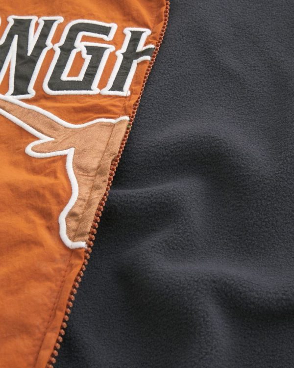 A classic windbreaker jacket featuring official licensed University of Texas at Austin Longhorns graphic applique at the front and back. Full zip-up closure, mock-neck collar, banded hems, fleece lining, pockets. Imported.