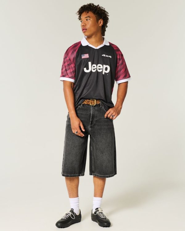 Classic denim half pants designed with a baggy leg. Washed black with fading and whiskering. Imported.