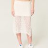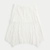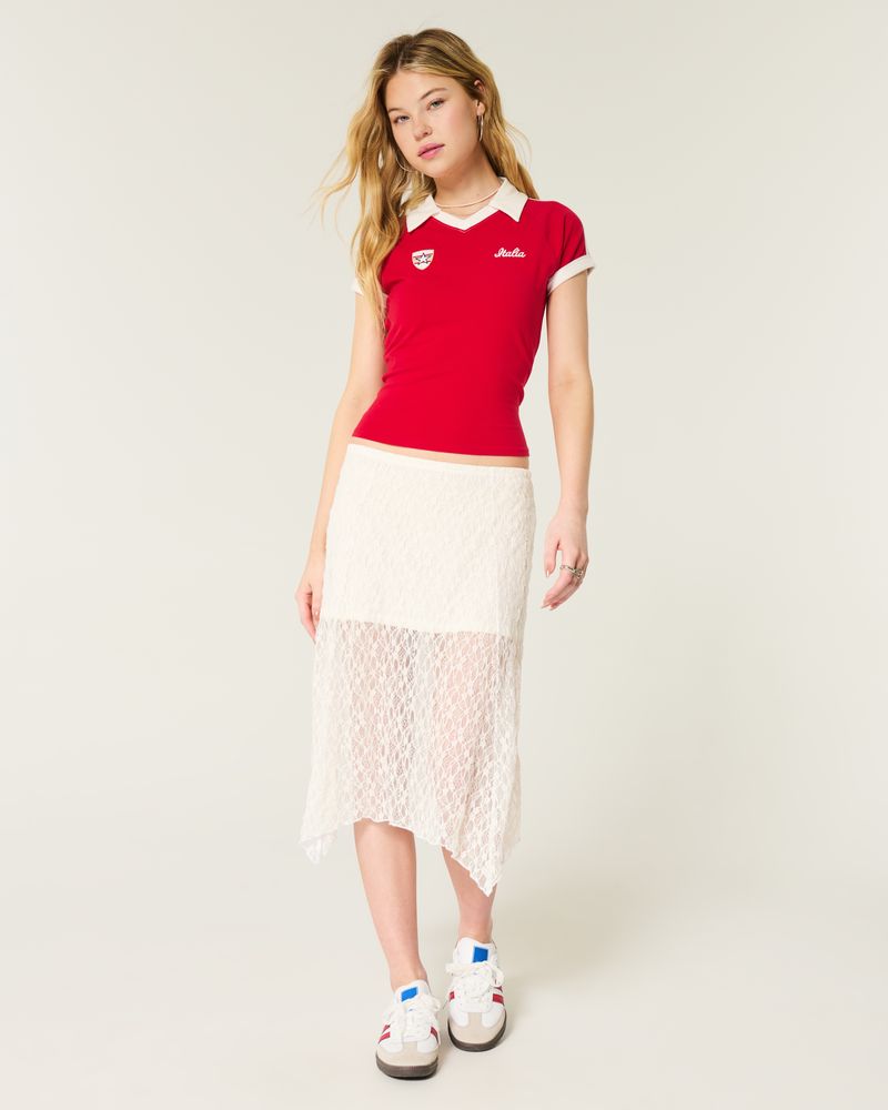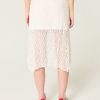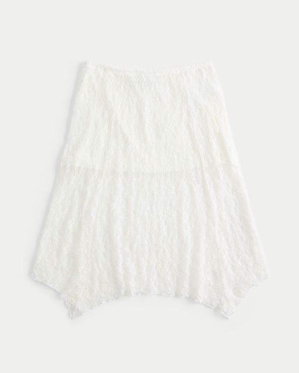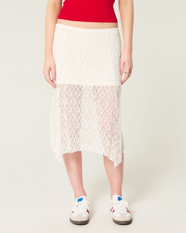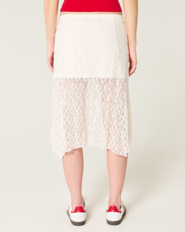 Flowy and super soft, this skirt is designed with a midi length and low-rise waist. Features pretty all-over lace fabric and an asymmetrical hem. Side seam zipper, mini-length lining. Imported.