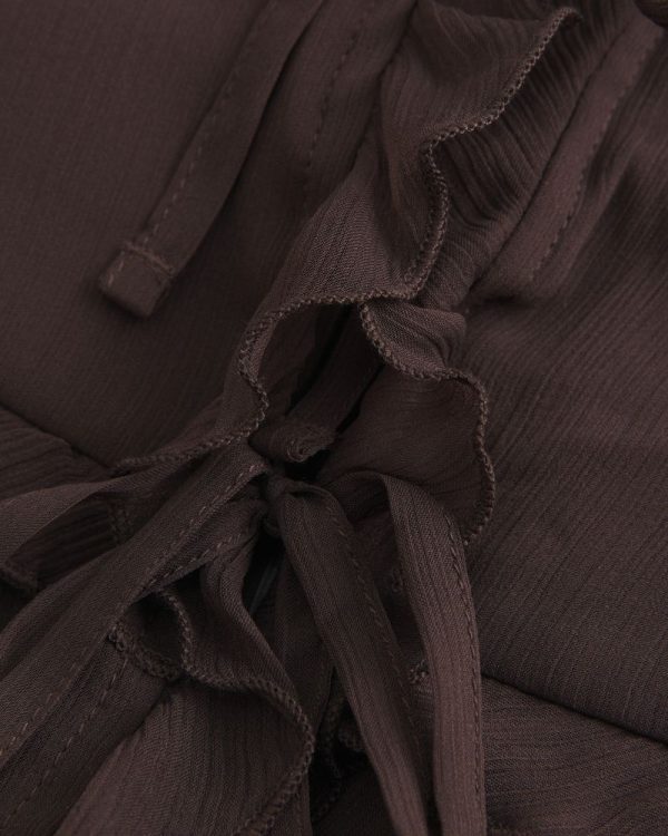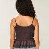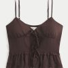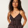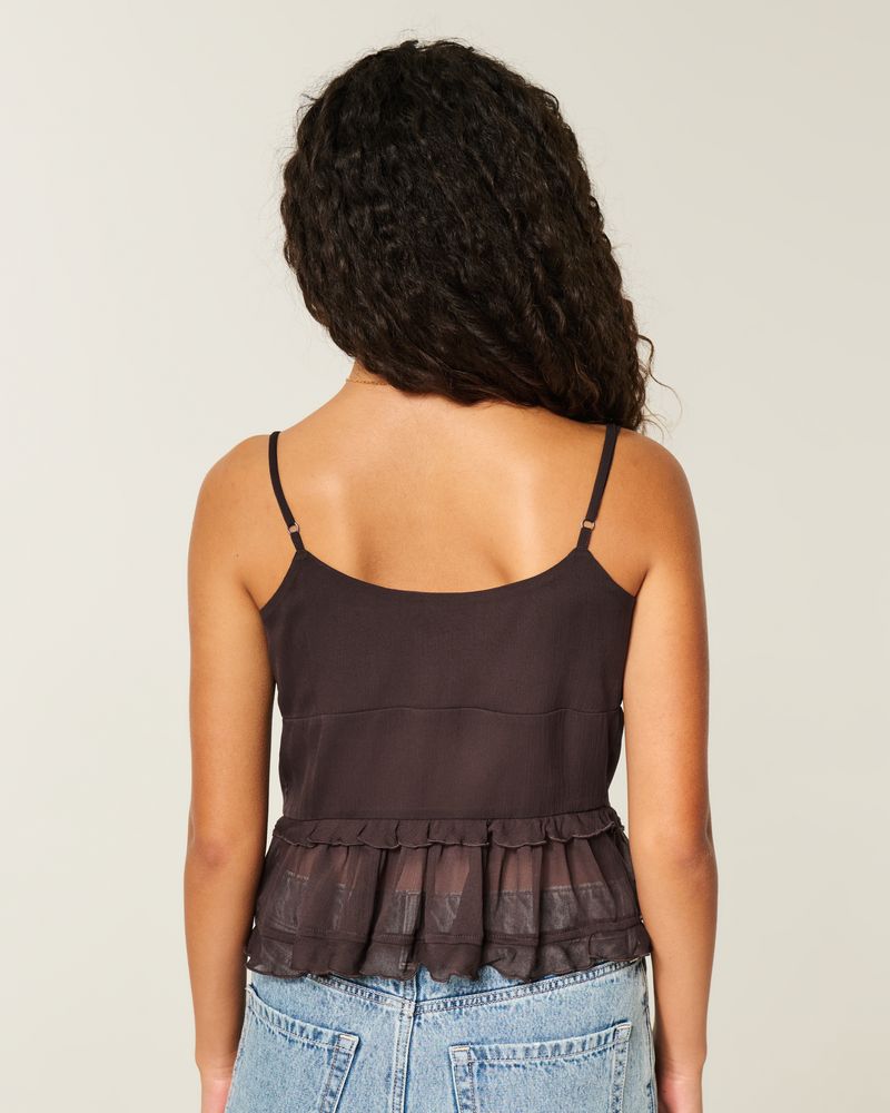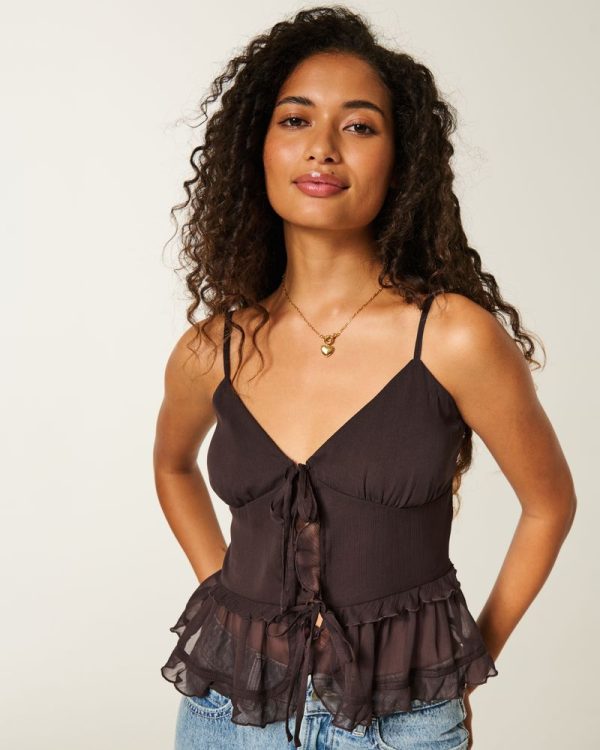 This pretty cami is made with super soft chiffon fabric and features ruffled details. Center tie detail, adjustable straps. Imported.