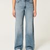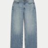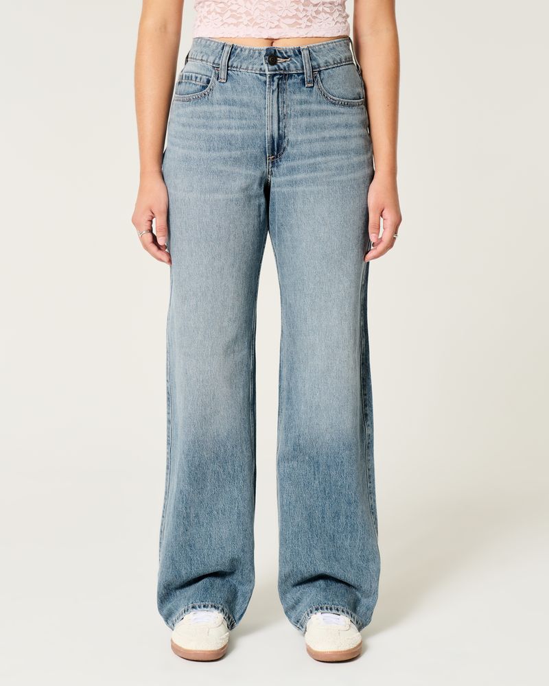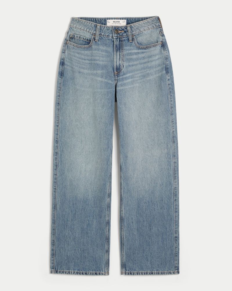 Flattering high-rise waist, medium wash denim with fading and whiskering. Baggy leg. Imported.