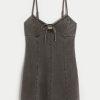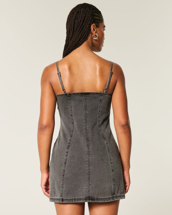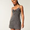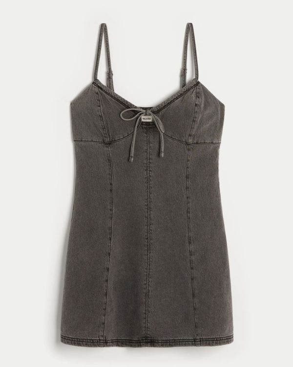 This cute denim mini dress features classic seam details and a tie at the center neckline. Adjustable straps. Imported.