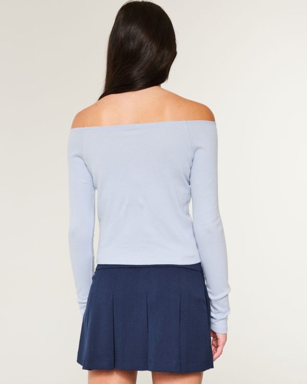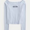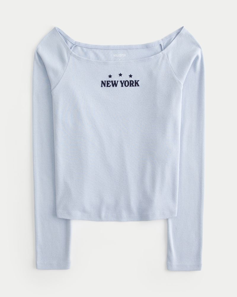 Super soft and comfy, this top features New York graphic flocking and an off-the-shoulder neckline. Long sleeves. Easy Fit. Imported.