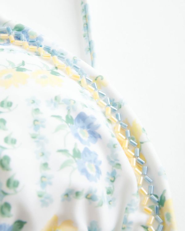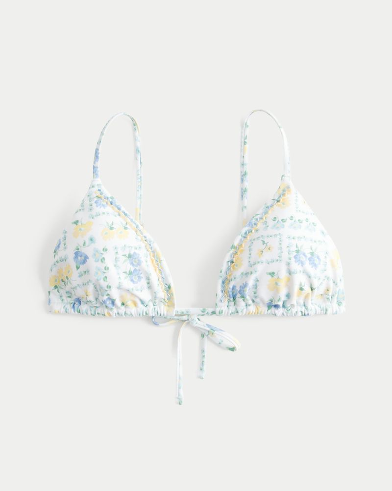 A cute bikini top designed with a classic triangle silhouette. Removable padding, adjustable straps, tie closure, bead details. Imported.