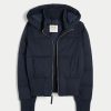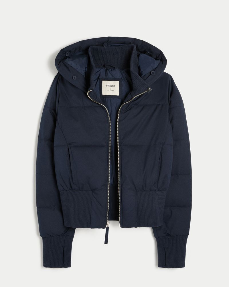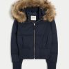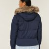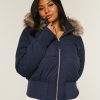 A cozy puffer bomber jacket designed with quilted channels, banded hems and a faux fur-trimmed hood. Mock-neck collar, thumb openings at sleeve cuffs, full zip-up closure, pockets. Imported.