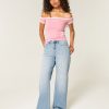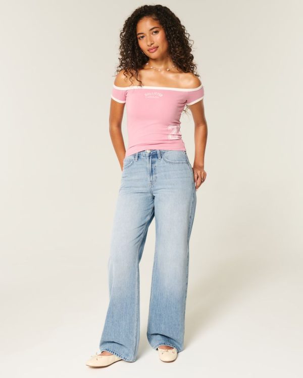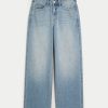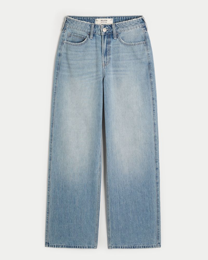 Comfortable denim jeans designed with a flattering high-rise waist and baggy leg. Medium wash with fading and whiskering. Imported.