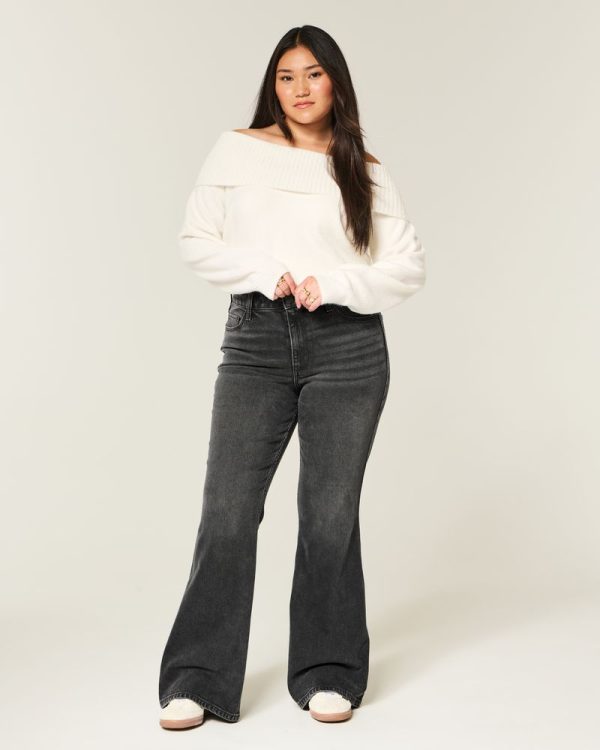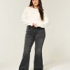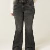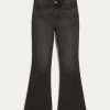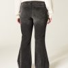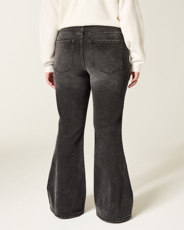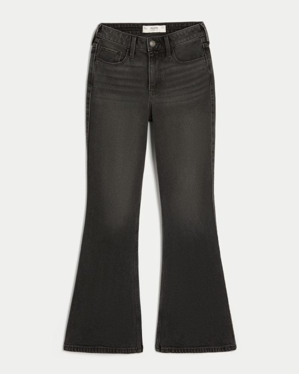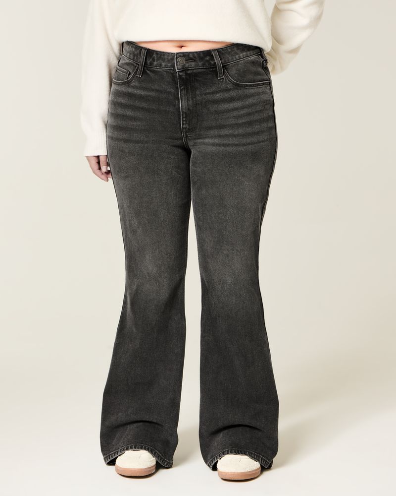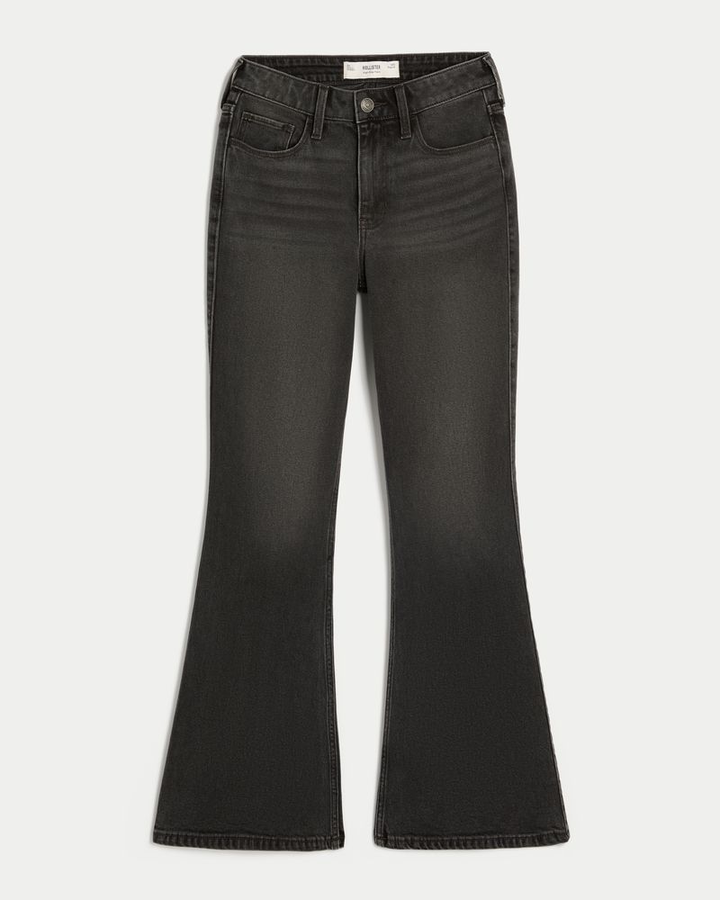 Cute and comfortable denim jeans in washed black, designed with a flattering high-rise waist and flared hem. Fading, whiskering, Vintage Stretch denim. Imported.