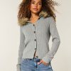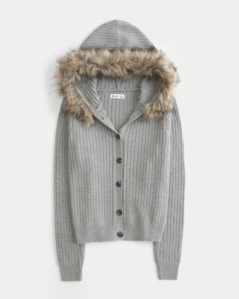 Cozy and super soft, this cardigan features a hood with faux fur trim and a full button closure. Long sleeves, ribbed trims. Slim Fit. Imported.