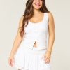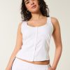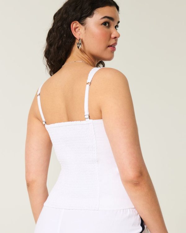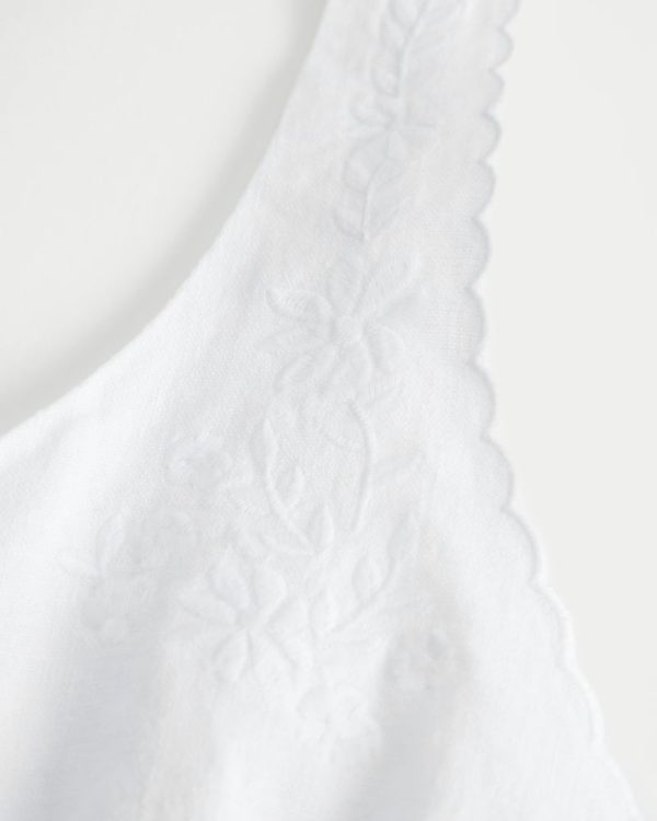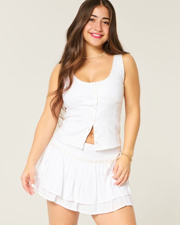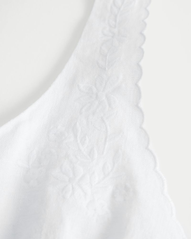 This pretty blouse features pretty embroidered detailing and scalloped trim along the straps, a scoop neckline and button-through closure. Soft smocked back. Slim Fit. Imported.