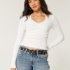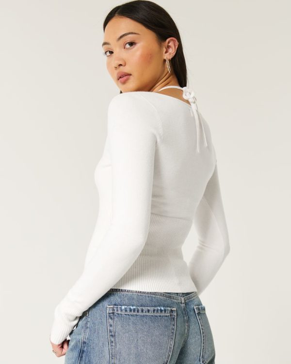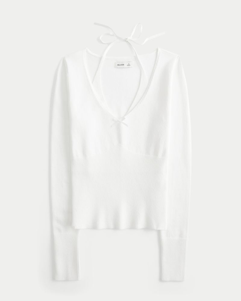 This super soft sweater features a v-neckline with a slim halter tie underneath for a layered look. Long sleeves, ribbed trims, v-neckline with cute bow detail. Slim Fit. Imported.