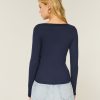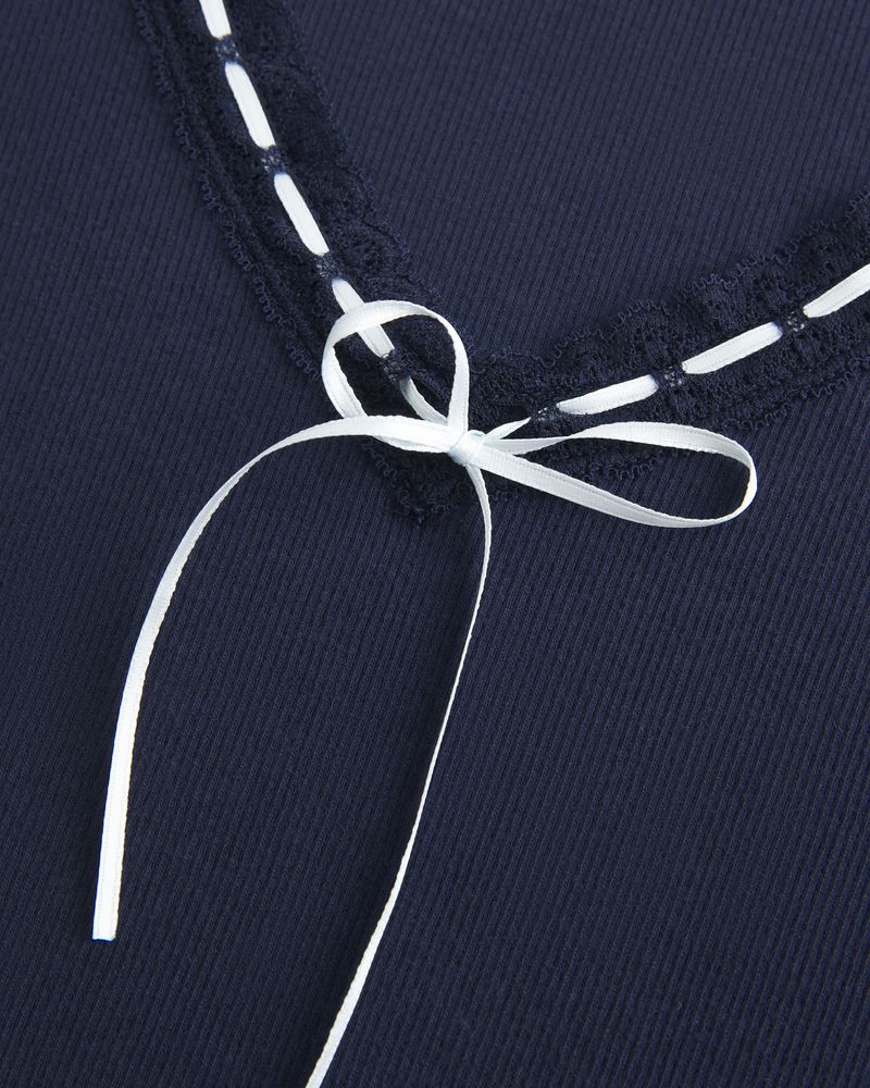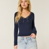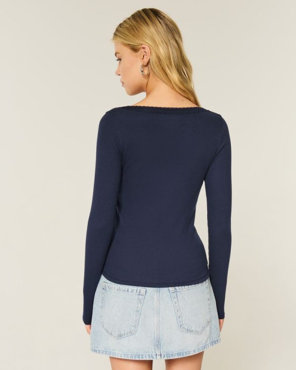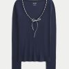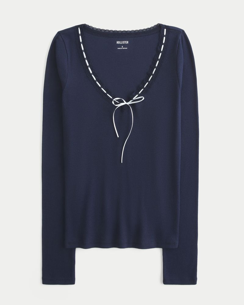 Super soft and comfy, this top features pretty lace trim along the neckline with an interwoven tie detail. Long sleeves. Imported.
