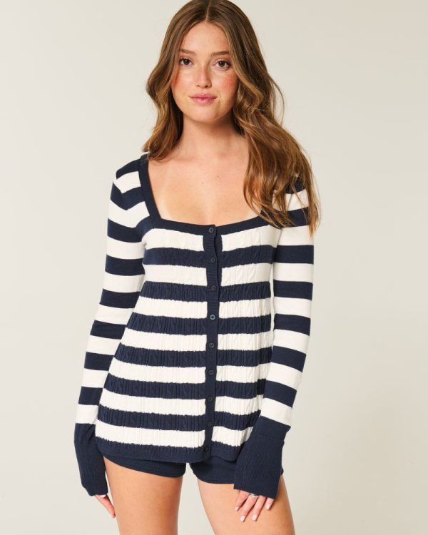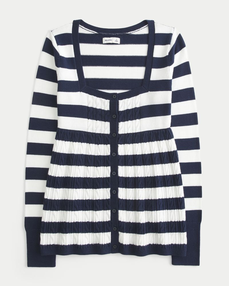 Perfect for layering with a cami or on its own, this long-sleeve sweater is designed with a square neckline and cute Y2K-inspired babydoll silhouette. Front button closure, cable-knit patterns, longer length. Easy Fit. Imported.