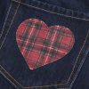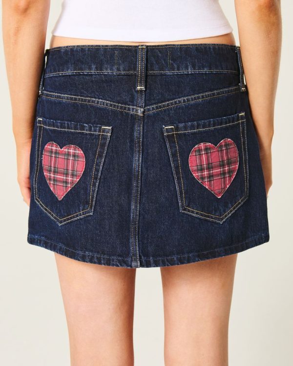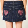 A cute, comfortable denim mini skort featuring a plaid heart applique at the back pocket. Built-in shorts, dark rinse wash, low-rise waist. Imported.