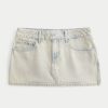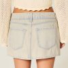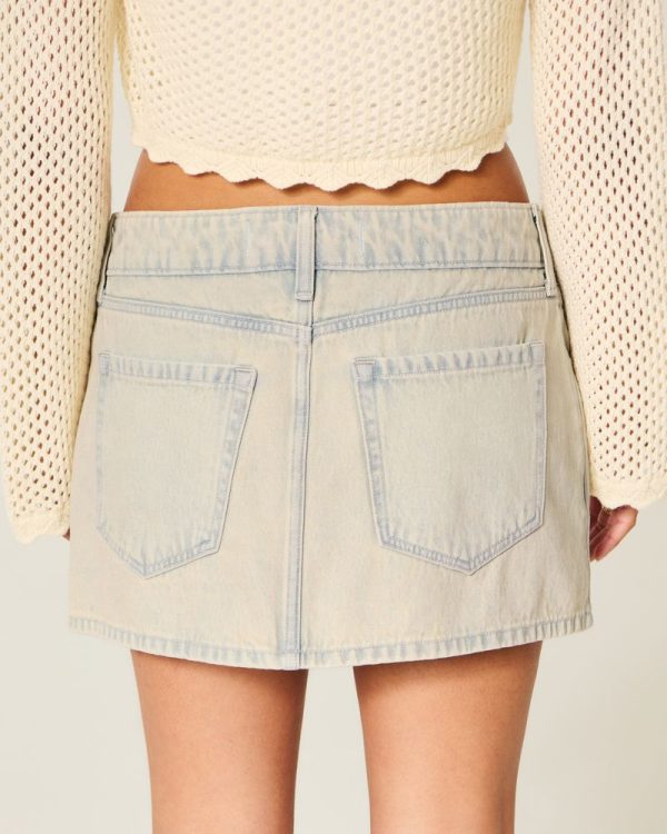 A cute denim mini skort designed with a low-rise waist and hidden knit shorts. Light acid wash. Imported.