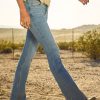 Designed with a low-rise waist, slim leg and boot hem. Light wash denim with fading, whiskering and stretch. Imported.