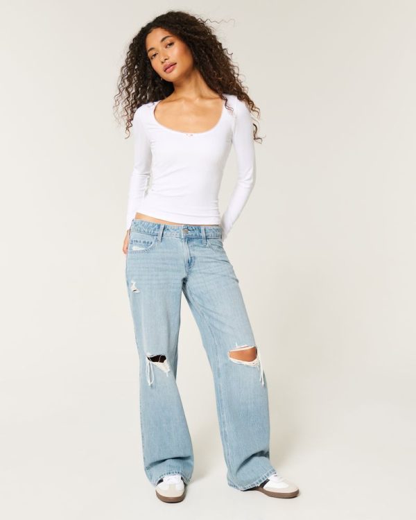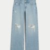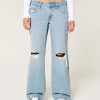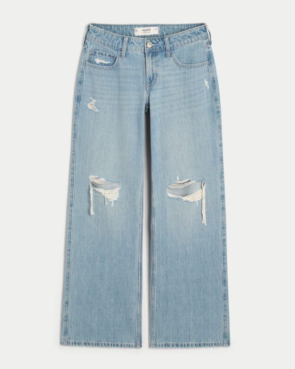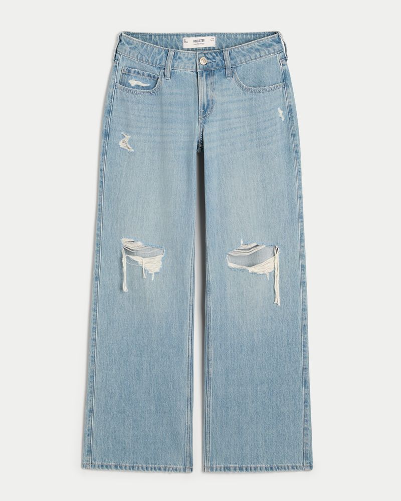 Ultra-comfortable jeans designed with a low-rise waist and baggy leg. Light wash denim with ripped details. Imported.