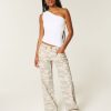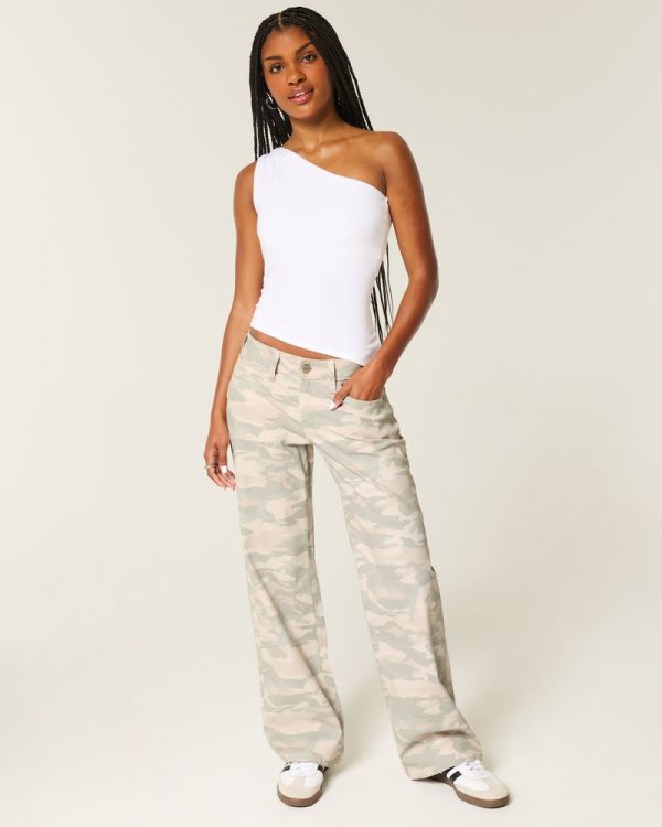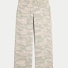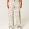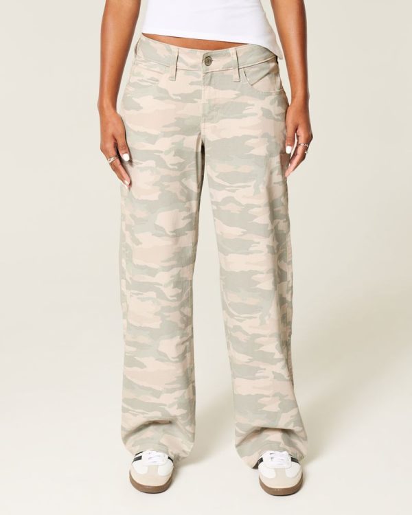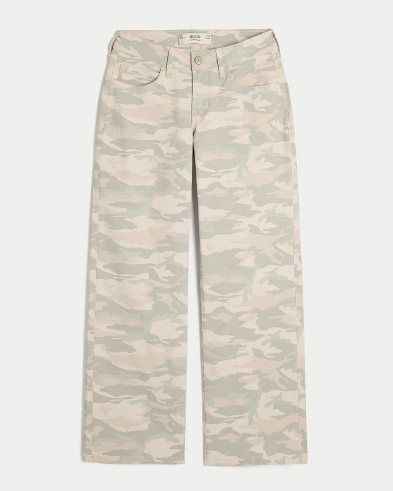 Comfortable Y2K-inspired denim jeans designed with a baggy leg and flattering low-rise waist. All-over camo pattern. Imported.