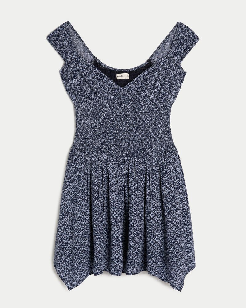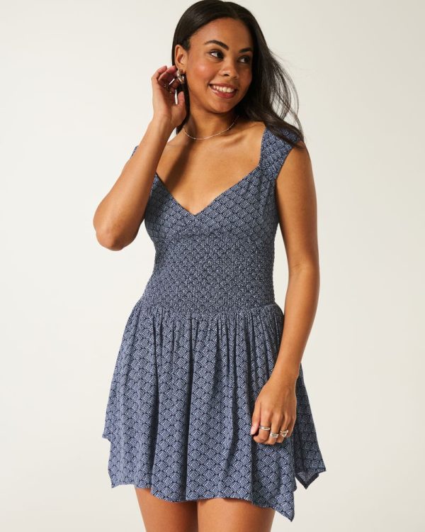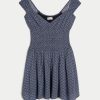 Pretty and super soft, this mini dress has an asymmetrical hem and off-the-shoulder cap sleeves. Soft smocked waist, pockets. Imported.
