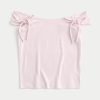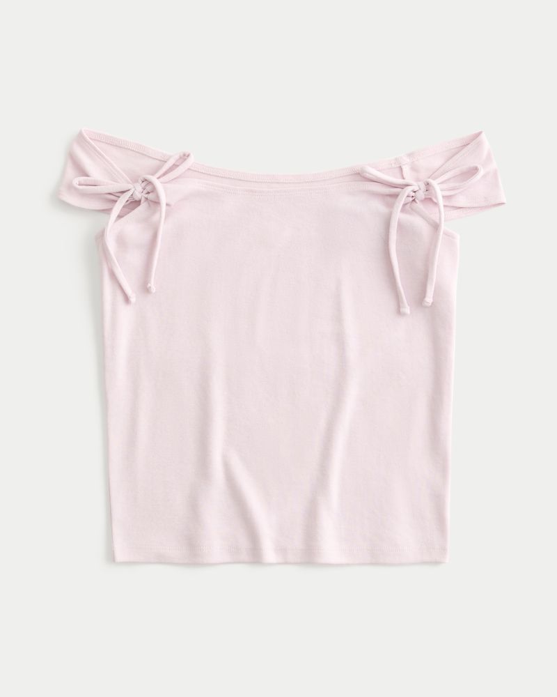 A super soft and cute top with an off-the-shoulder neckline and tie details. Slim Fit. Imported.