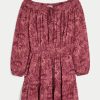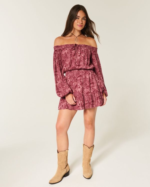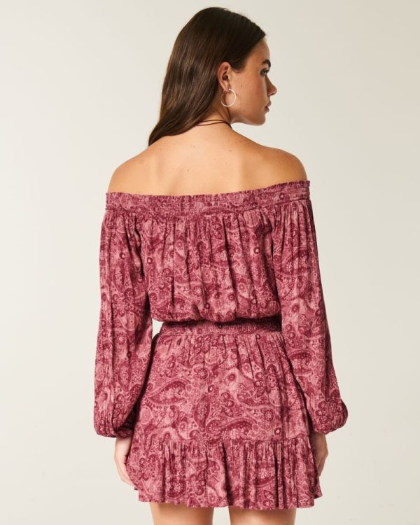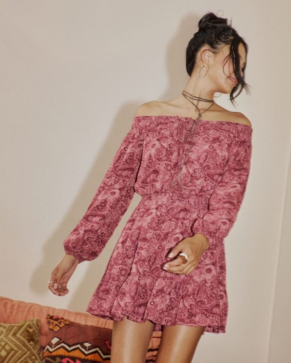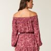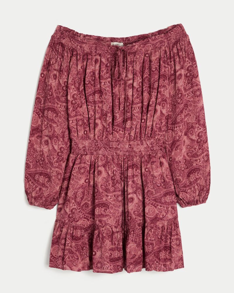 A flowy and super soft dress featuring a relaxed neckline that can be worn on or off the shoulder. Center tie detail at neckline, long sleeves, all-over pattern. Imported.