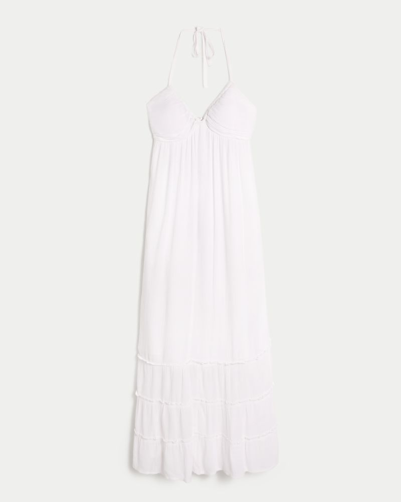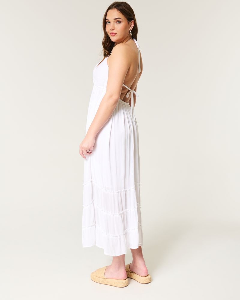 Super soft, flowy and fun, this dress features halter straps, pockets and a back tie detail. Removable pads, tiered hem, maxi length. Imported.