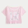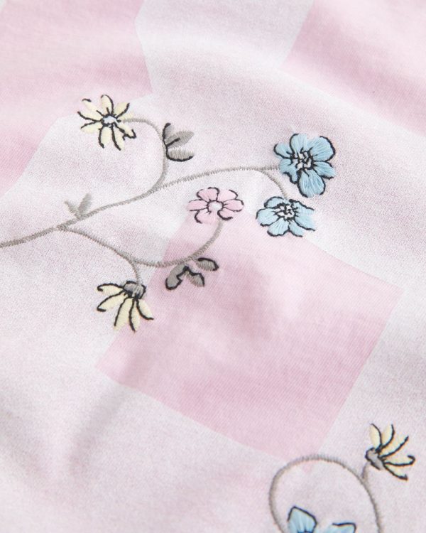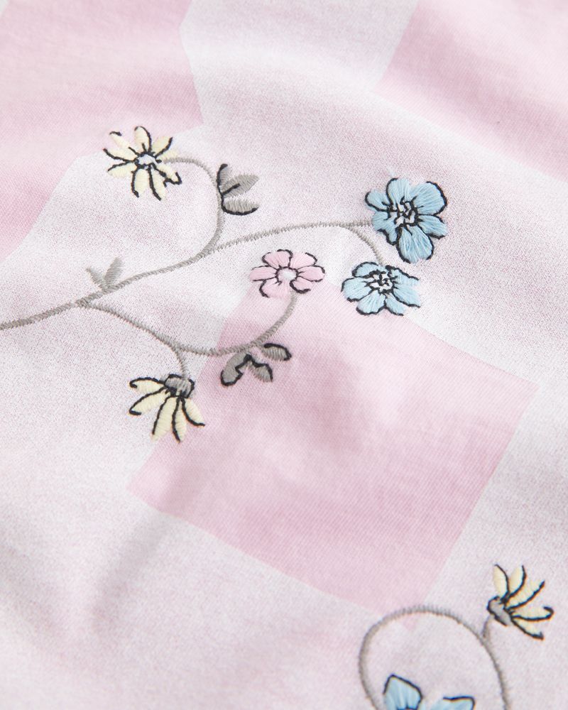 A super soft tee featuring a varsity-style number print graphic with embroidered floral details and an off-the-shoulder neckline. Short sleeves. Oversized Fit. Imported.