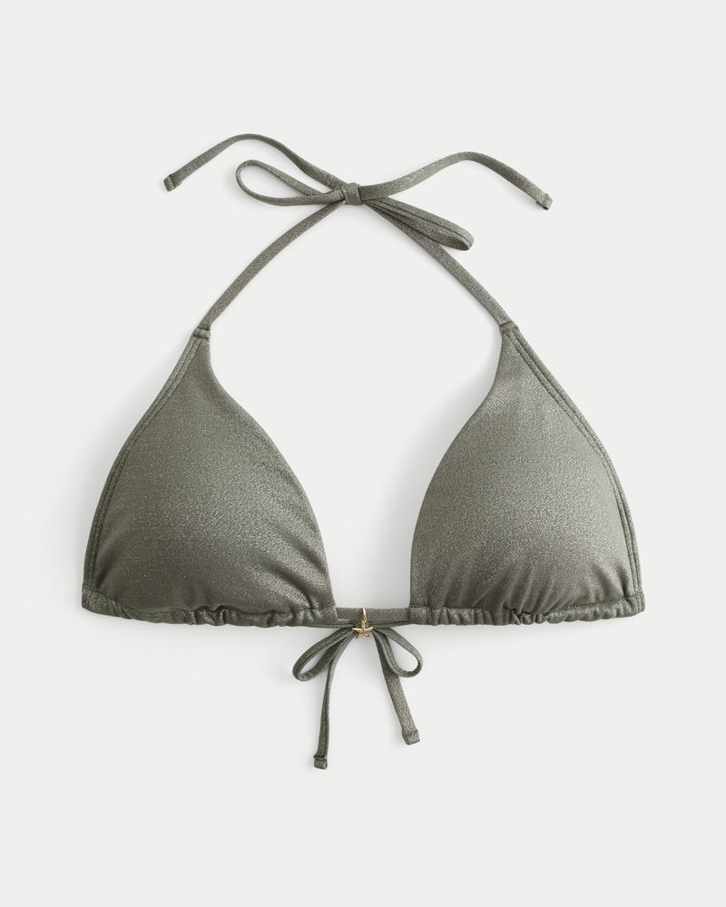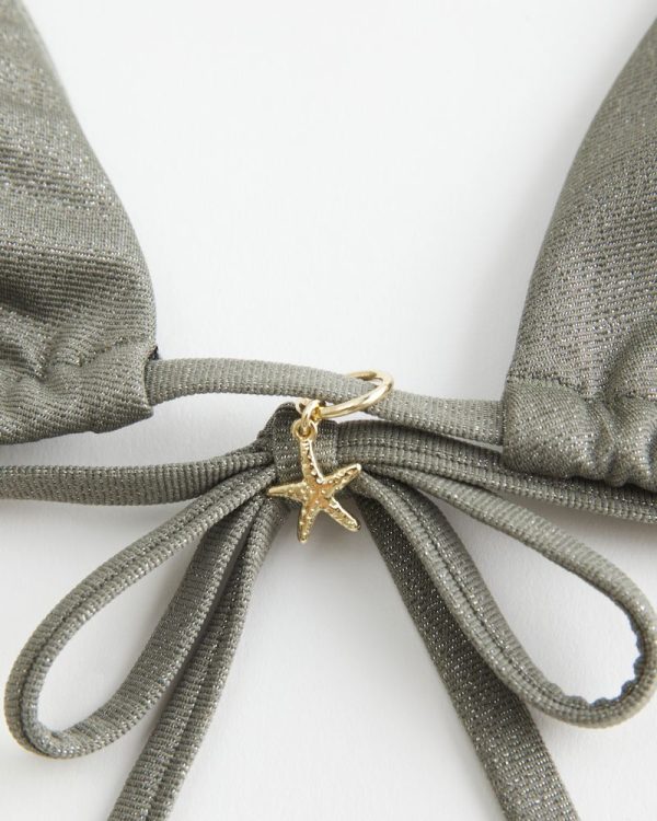 Made with soft swim fabric with shimmer, this bikini top is designed to be worn as a halter or flipped upside-down for a bandeau/triangle look. Cute metal charm detail. Imported.