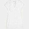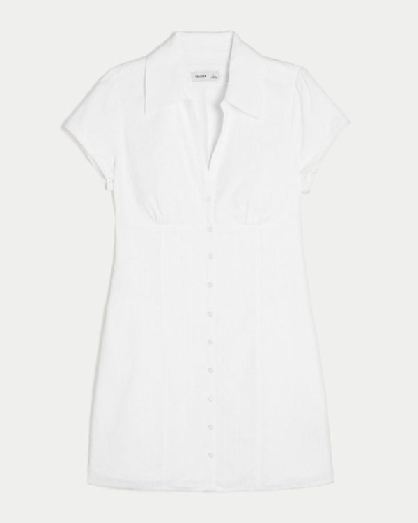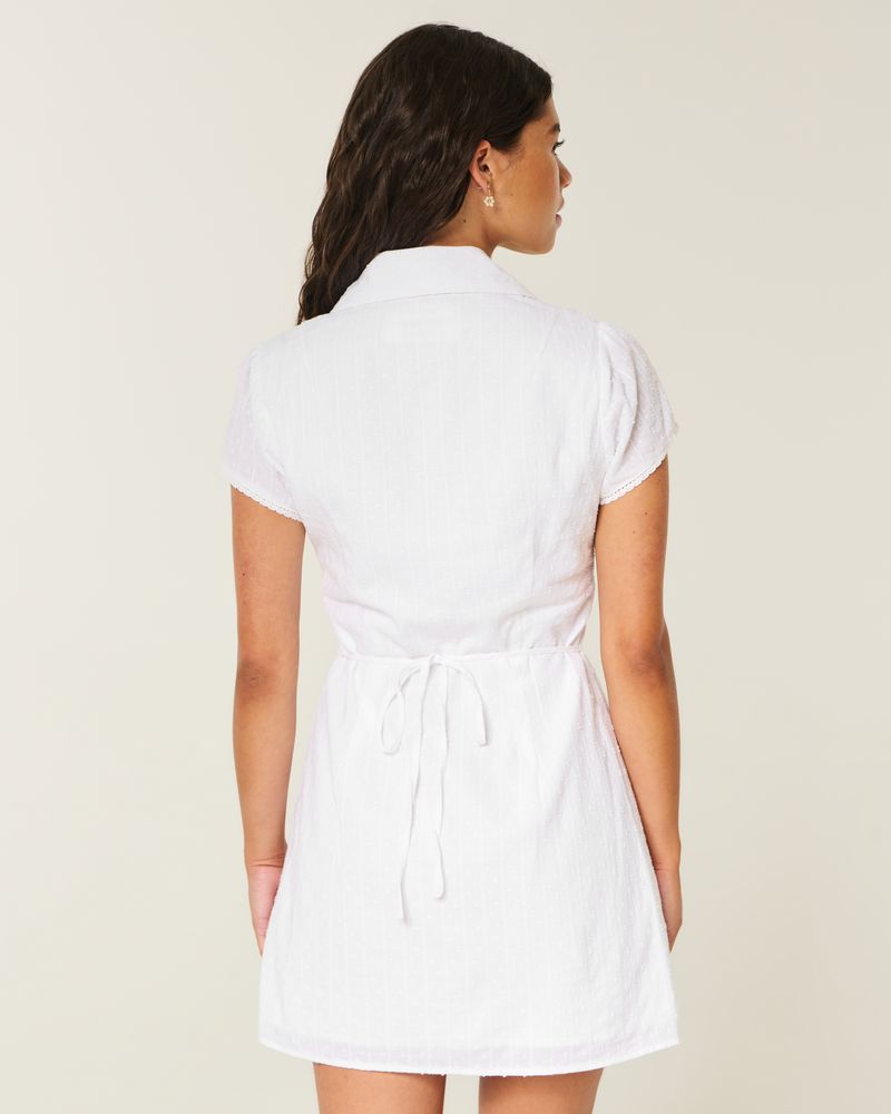 A cute shirt dress with center buttons and a collar. Short sleeves with scalloped lace trim. Imported.