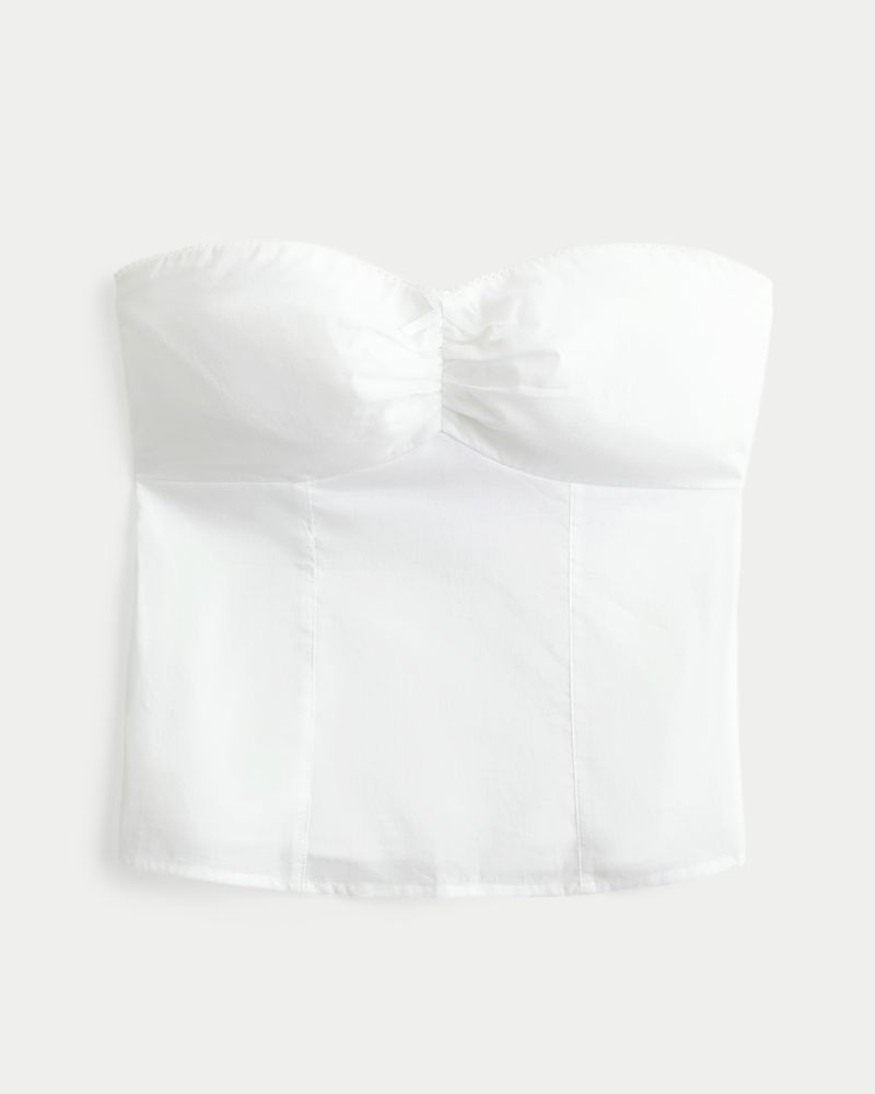 A cute, soft top featuring cinched detailing at the bust and a bow detail at the center neckline, plus pretty picot lace trim along the neckline. Strapless. Slim Fit. Imported.