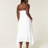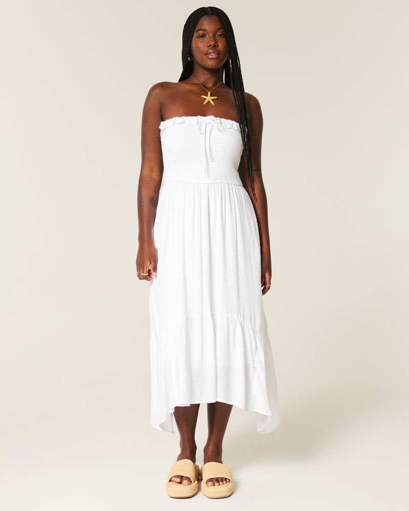 Flowy and super soft, this maxi-length dress features an asymmetrical hem and soft smocked bodice. Pretty ruffled neckline with center tie detail. Imported.